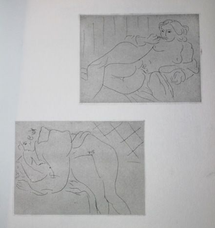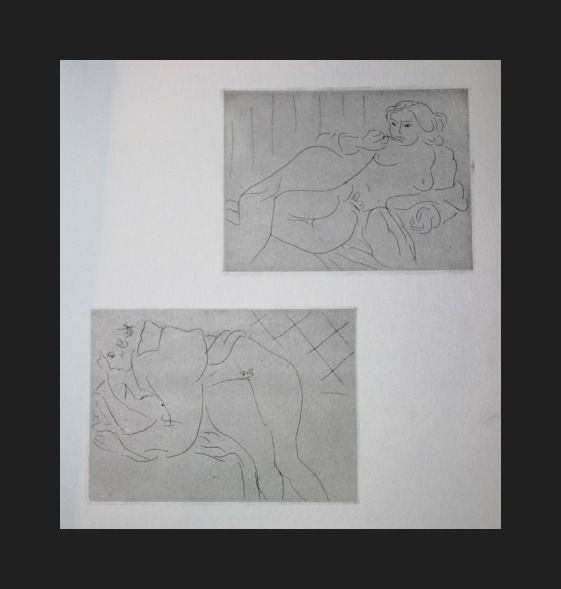 HENRI MATISSE "NUDE ON A COUCH" & "WOMAN READING" - VINTAGE LITHOGRAPH AFTER THE 1929 ETCHINGS - PRINTED IN 1956 - PUBLISHED BY GEORGE BRAZILLER NEW YORK - PROFESSIONALLY FRAMED AND MATTED - GALLERY STYLE WITH BLACK ACID FREE MAT AND SOLID WOOD BLACK FRAME - SHEET 11"X 8" - EACH IMAGE APPX 3.5" X 4.5"