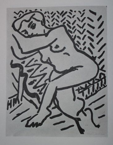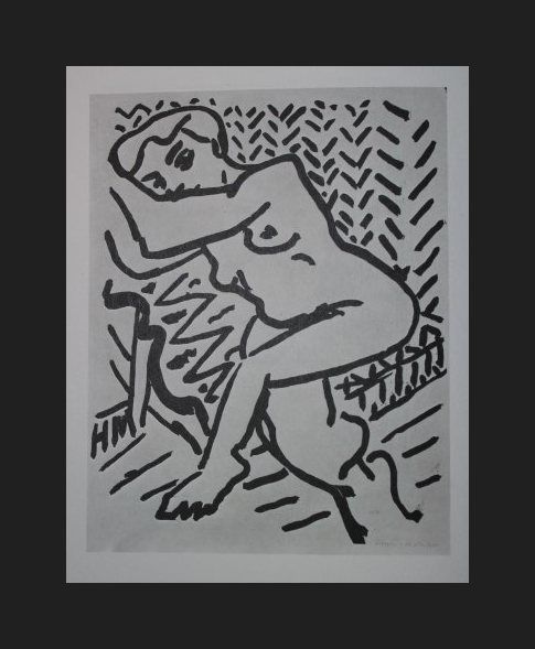 HENRI MATISSE "SEATED NUDE" - VINTAGE LITHOGRAPH AFTER THE 1906 LINOLEUM CUT - PRINTED IN 1956 - PUBLISHED BY GEORGE BRAZILLER NEW YORK - PROFESSIONALLY FRAMED AND MATTED - GALLERY STYLE WITH BLACK ACID FREE MAT AND SOLID WOOD BLACK FRAME - SHEET 11"X 8" - IMAGE APPX 7" X 5.25"
