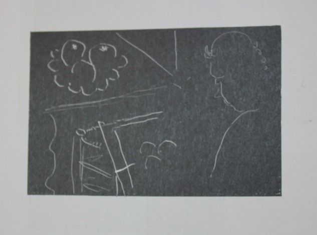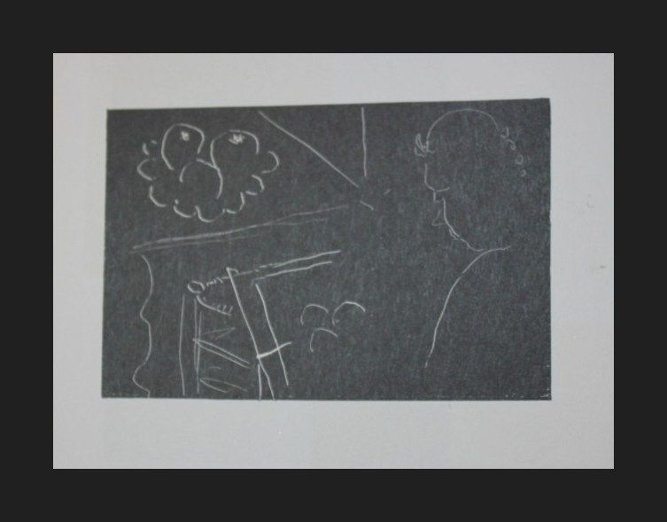 HENRI MATISSE "INTERIOR: ARTIST DRAWING THREE APPLES" - VINTAGE LITHOGRAPH AFTER THE 1914 MONOTYPE - PRINTED IN 1956 - PUBLISHED BY GEORGE BRAZILLER NEW YORK - PROFESSIONALLY FRAMED AND MATTED - GALLERY STYLE WITH BLACK ACID FREE MAT AND SOLID WOOD BLACK FRAME - IMAGE APPX 3.75" X 5"