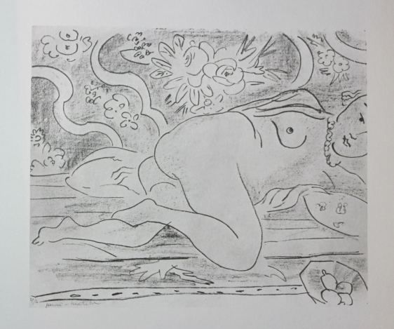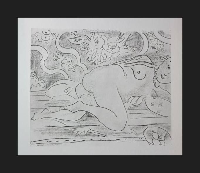 HENRI MATISSE "RECLINING NUDE" - VINTAGE LITHOGRAPH AFTER THE 1924 LITHOGRAPH - PRINTED IN 1956 - PUBLISHED BY GEORGE BRAZILLER NEW YORK - PROFESSIONALLY FRAMED AND MATTED - GALLERY STYLE WITH BLACK ACID FREE MAT AND SOLID WOOD BLACK FRAME - IMAGE APPX 5.25" X 6.5"