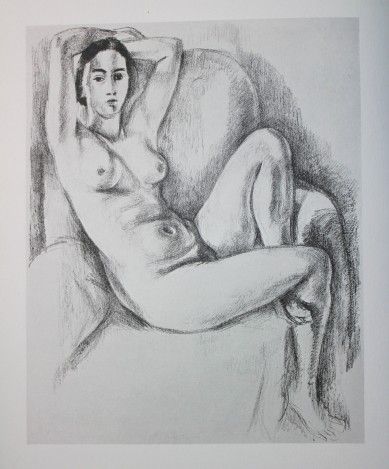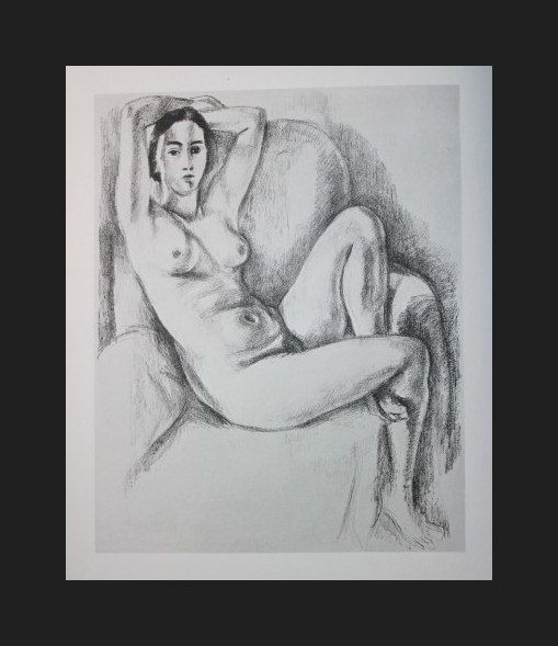 HENRI MATISSE "SEATED NUDE WITH ARMS RAISED" - VINTAGE LITHOGRAPH AFTER THE 1924 LITHOGRAPH - PRINTED IN 1956 - PUBLISHED BY GEORGE BRAZILLER NEW YORK - PROFESSIONALLY FRAMED AND MATTED - GALLERY STYLE WITH BLACK ACID FREE MAT AND SOLID WOOD BLACK FRAME - IMAGE APPX 8" X 6.5"