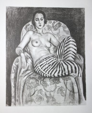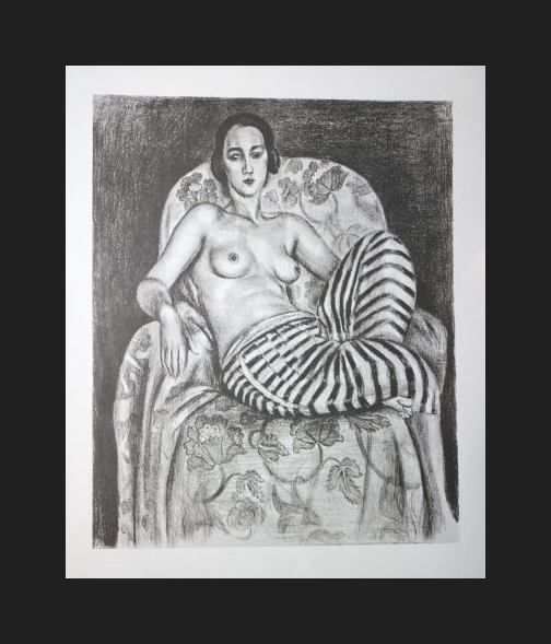 HENRI MATISSE "ODALISQUE IN STRIPED PANTALOONS" - VINTAGE LITHOGRAPH AFTER THE 1925 LITHOGRAPH - PRINTED IN 1956 - PUBLISHED BY GEORGE BRAZILLER NEW YORK - PROFESSIONALLY FRAMED AND MATTED - GALLERY STYLE WITH BLACK ACID FREE MAT AND SOLID WOOD BLACK FRAME - IMAGE APPX 8" X 6.25"