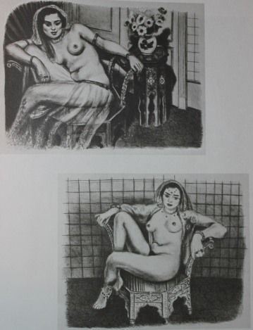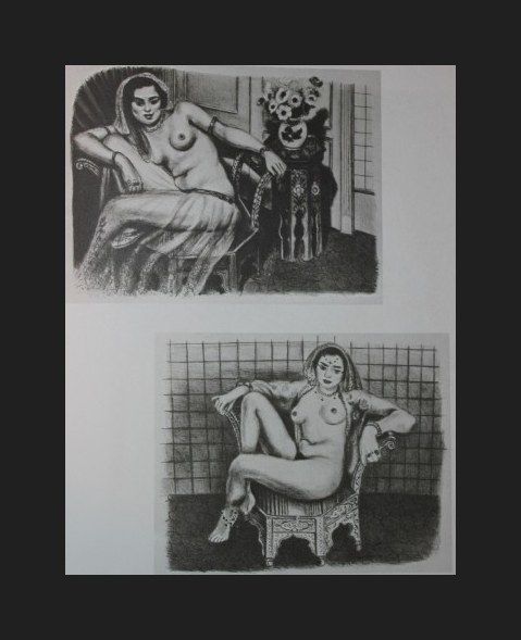 HENRI MATISSE "ODELISQUE IN A TULLE SKIRT" & "SEATED ODALISQUE" - VINTAGE LITHOGRAPH AFTER THE 1928 LITHOGRAPHS - PRINTED IN 1956 - PUBLISHED BY GEORGE BRAZILLER NEW YORK - PROFESSIONALLY FRAMED AND MATTED - GALLERY STYLE WITH BLACK ACID FREE MAT AND SOLID WOOD BLACK FRAME - EACH IMAGE APPX 4.25" X 5.5"
