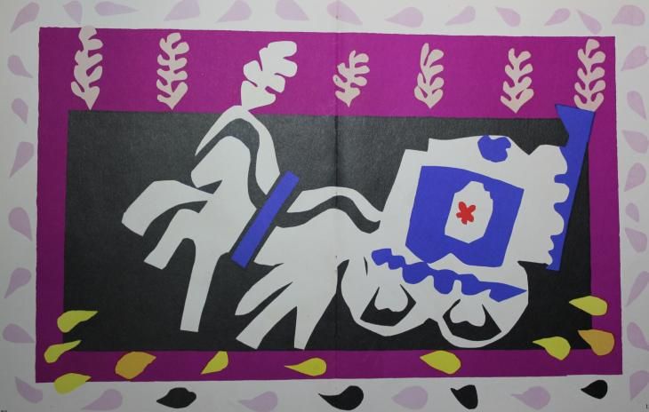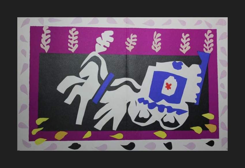 HENRI MATISSE "THE BURIAL OF PIERROT" FROM "JAZZ" - VINTAGE LITHOGRAPH IN COLORS - AFTER THE 1944 COLOR STENCIL - PRINTED IN 1956 - PUBLISHED BY GEORGE BRAZILLER NEW YORK - PROFESSIONALLY FRAMED AND MATTED - GALLERY STYLE WITH BLACK ACID FREE MAT AND SOLID WOOD BLACK FRAME - IMAGE APPX 16" X 10"