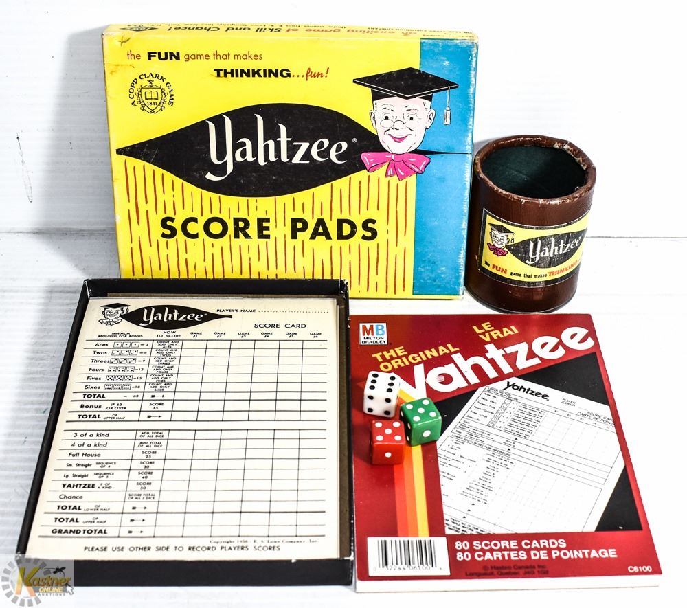 PADS IN ORGINAL BOX (FEW MISSING ONLY) W/MILTON BRADLEY SCORE PADS (UNUSED) WITH DICE SHAKER