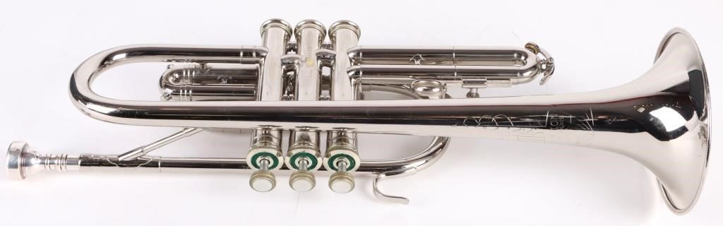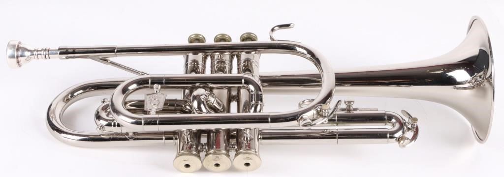 Vintage 1960's Holton Galaxy Coronet Nickel Silver w/ Vincent Bach 1-1/2C mouthpiece. Mouthpiece is stuck and valves need valve oil.