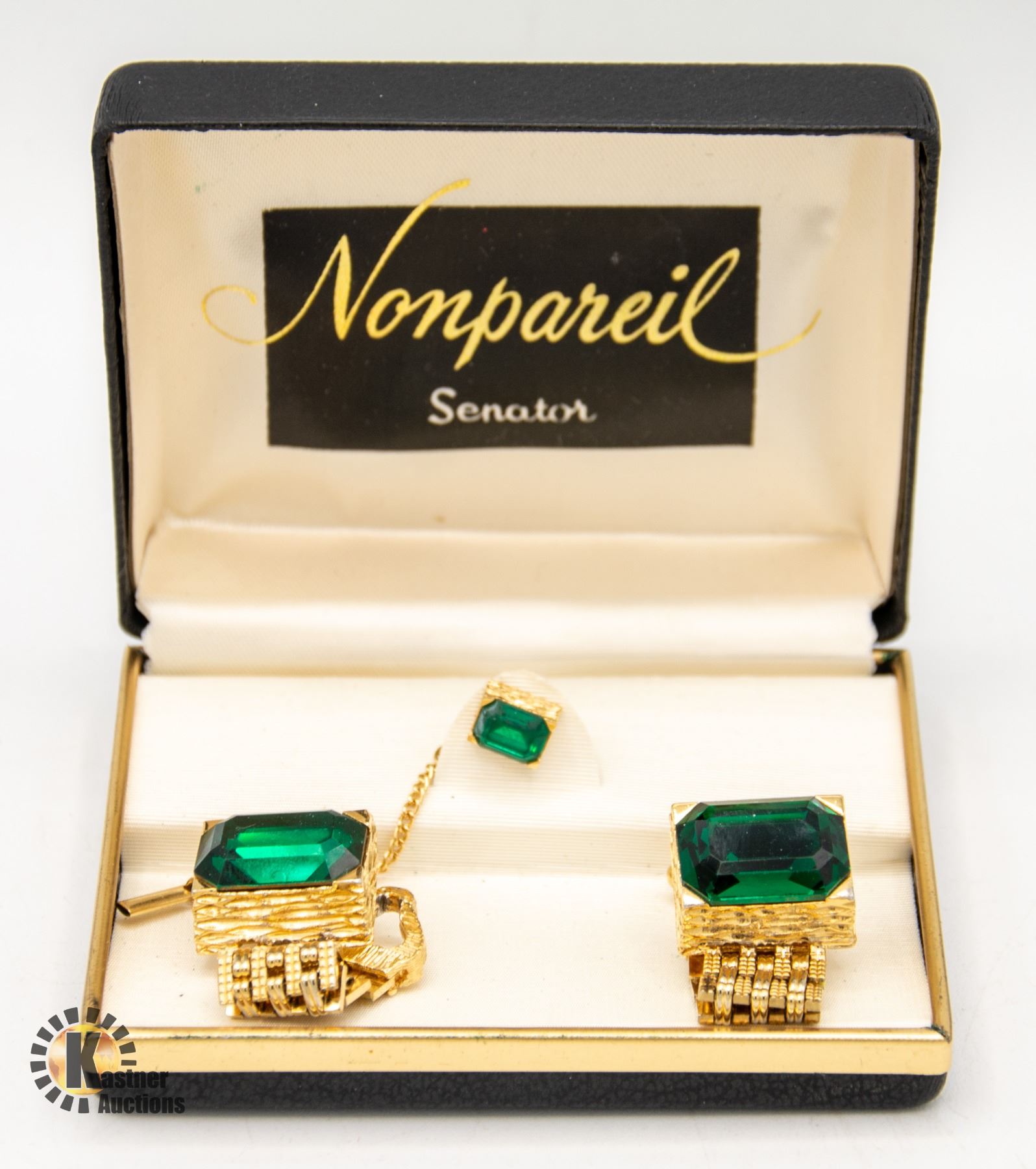 SENATOR 3-PC CUFFLINKS IN ORIGINAL BOX GREEN (UNUSED) **ALL ITEMS MUST BE REMOVED BY 5PM SATURDAY, MAY 6TH 2023. ALL REMAINING ITEMS WILL BE SUBJECT TO A $6.00 PER DAY STORAGE CHARGE. ANY ITEMS REMAINING AFTER MONDAY, MAY 22ND, 2023 WILL BE CONSIDERED FORFEITED. NO REFUNDS WILL BE ISSUED FOR FORFEITED ITEMS. TO SCHEDULE A PICK UP APPOINTMENT CLICK HERE