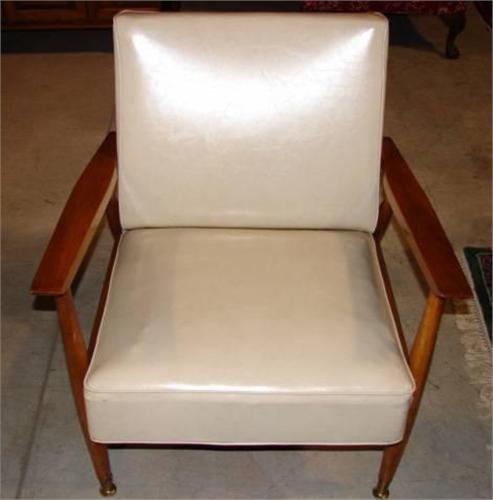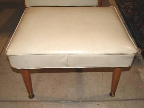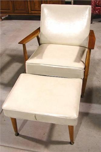 VINTAGE 1960S ARM CHAIR & OTTOMAN. Chair has vinyl seat and back that shows a small amount of tearing. Wooden frame. Chair: 7.5” H to top of back, 26” W, 15.5” H to top of seat. Ottoman: 14” H, 20.5” x 16”