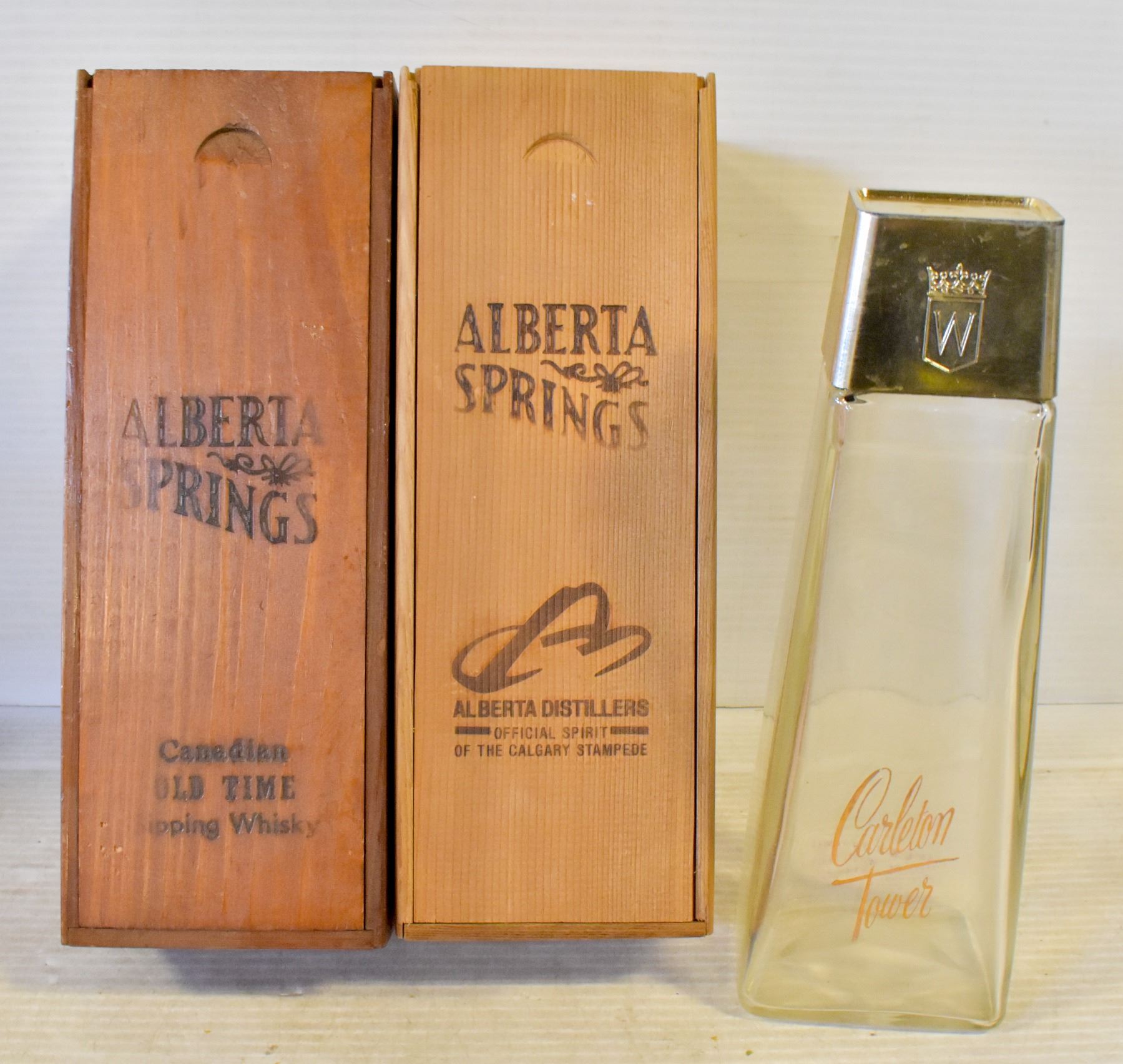 WHISKEY BOTTLE & W/2 ALBERTA SPRINGS WOODEN BOX'S 1 CALGARY STAMPEDE