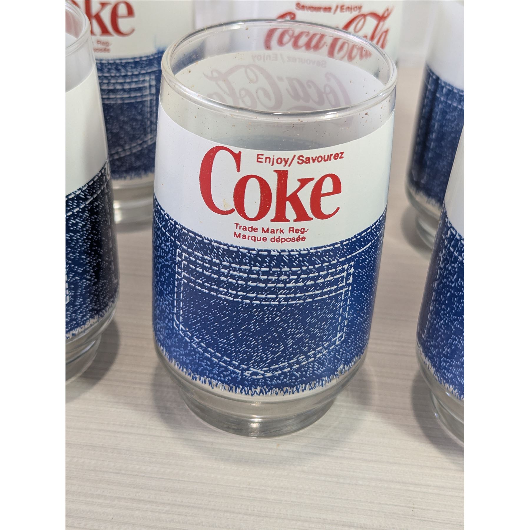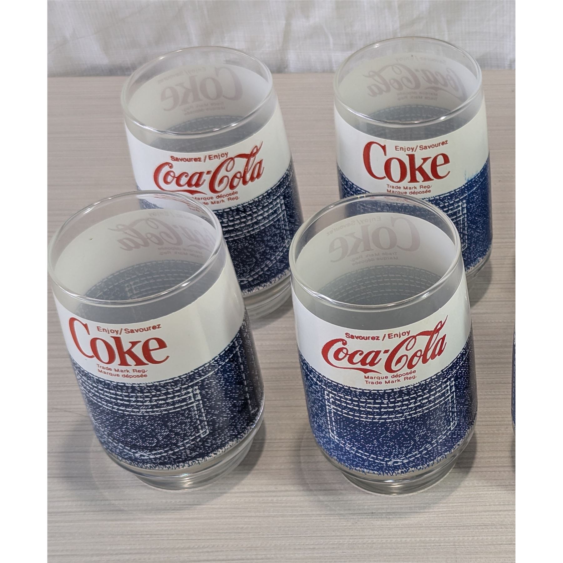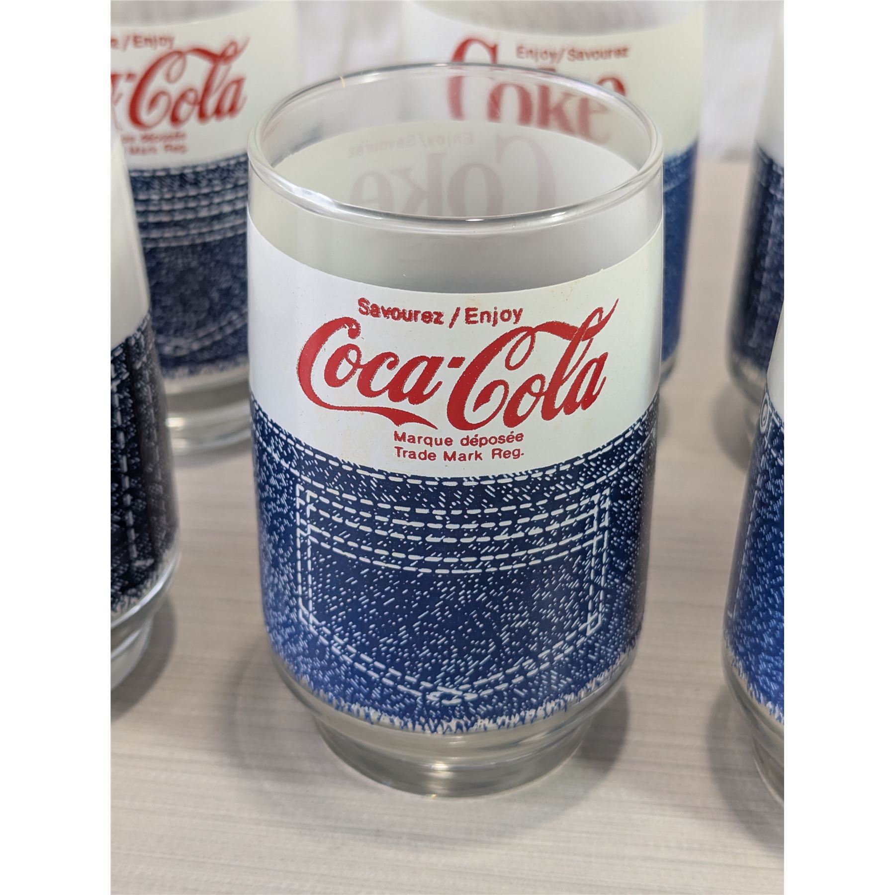 Vintage 1970's Coca-Cola glass tumblers (4 in one lot) featuring a denim jeans design.