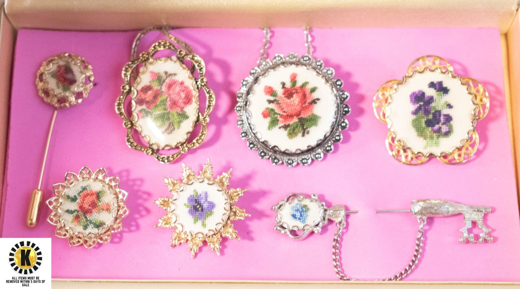 2 NECKLACES WITH CHAINS, 3 BROOCHES, 2 STICK PINS, NECKLACES CAN ALSO BE WORN AS BROOCHES