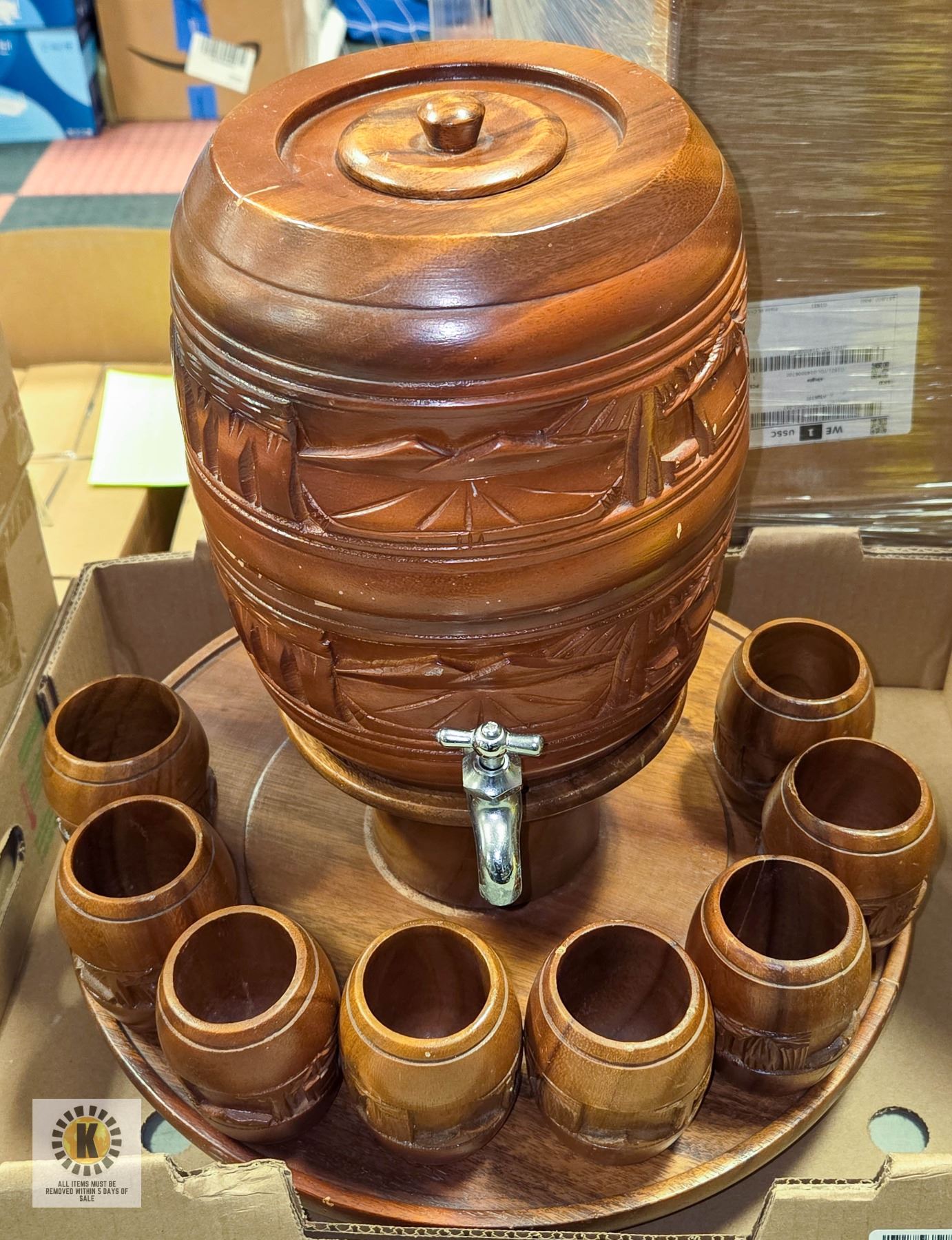 WHISKEY BARREL SET WITH KEG TAP 8 SHOT CUP GLASSES ON LAZY SUSAN STAND **ALL ITEMS MUST BE REMOVED BY 5PM SATURDAY, APRIL 3RD 2025. ALL REMAINING ITEMS WILL BE SUBJECT TO A $6.00 PER DAY STORAGE CHARGE. ANY ITEMS REMAINING AFTER MONDAY, MAY 19TH 2025 WILL BE CONSIDERED FORFEITED. NO REFUNDS WILL BE ISSUED FOR FORFEITED ITEMS. TO SCHEDULE A PICK UP APPOINTMENT CLICK HERE