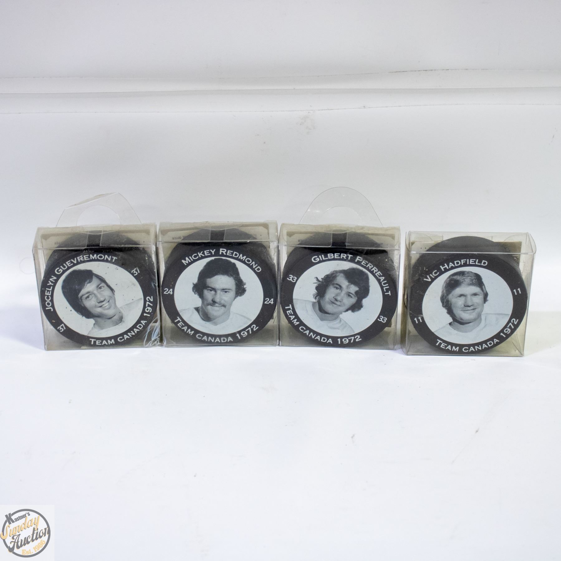 LOT OF 4 BACARDI NHL TEAM CANADA HOCKEY PUCKS #37 JOCELYN GUEVREMONT, #24 MICKEY REDMOND, #11 VIC HADFIELD ,#33 GILBERT PERREAULT **ALL ITEMS MUST BE REMOVED BY 5PM SATURDAY, APRIL 18TH 2026. ALL REMAINING ITEMS WILL BE SUBJECT TO A $6.00 PER DAY STORAGE CHARGE. ANY ITEMS REMAINING AFTER MONDAY, MAY 4TH 2026 WILL BE CONSIDERED FORFEITED. NO REFUNDS WILL BE ISSUED FOR FORFEITED ITEMS. TO SCHEDULE A PICK UP APPOINTMENT CLICK HERE