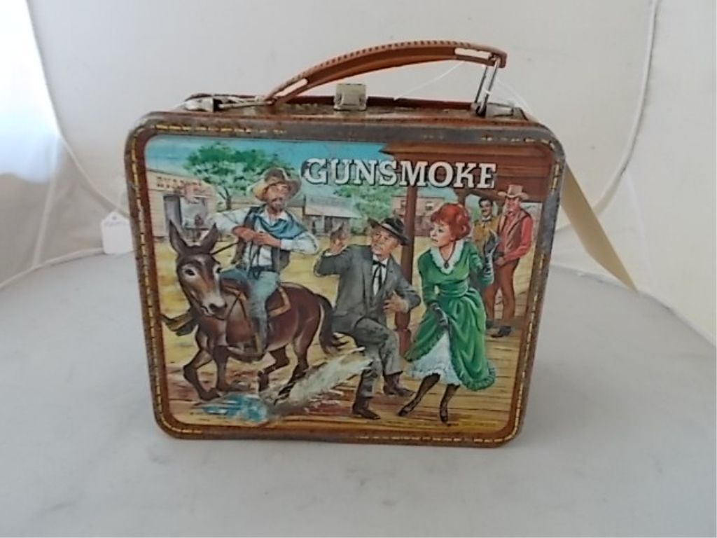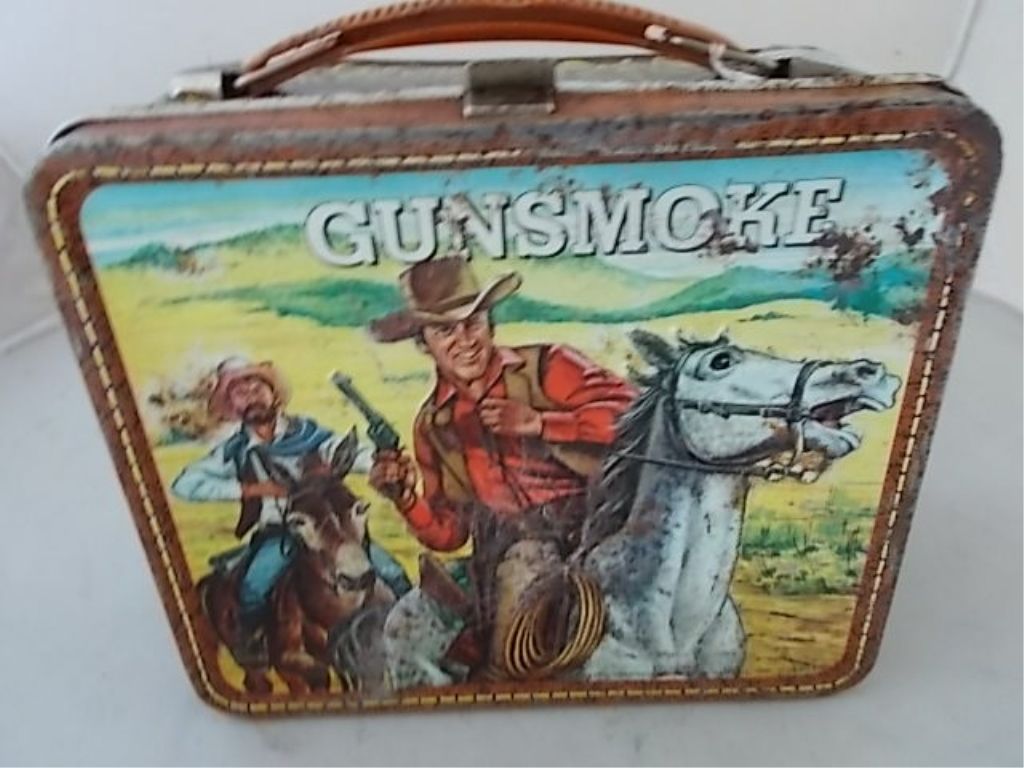 VINTAGE 1973 GUNSMOKE METAL LUNCH BOX COLUMBIA BROADCASTING MADE BY: ALADDIN INDUSTRIES WITHOUT THE THERMOS THERE IS SCRATCHES, DENTS, RUST AND SOME WEAR ON THIS PIECE,