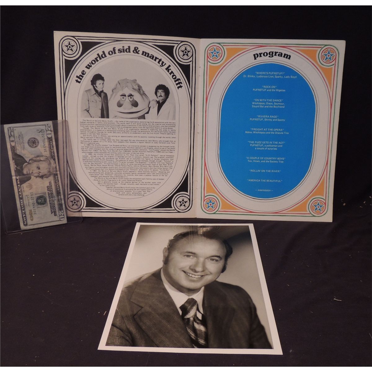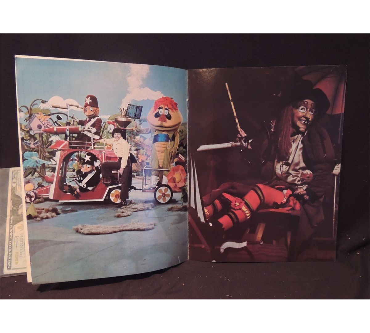 Offered here is a very cool and rare vintage 1974 The World of Sid & Marty Krofft's The H.R. PufnStuf Show Program with over 5 pages with colored pictures and text. Also included is a black and white photograph of what looks to be either Sid or Marty Krofft at a younger age that was inside the program.