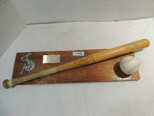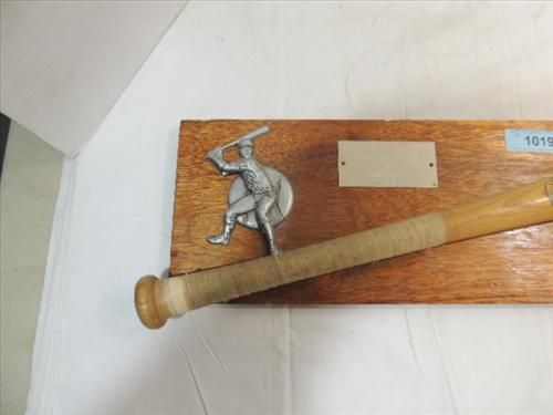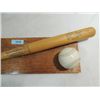 VINTAGE 1983 BASEBALL BAT & SOFTBALL ON PLAQUE WITH DIE CAST BASEBALL BATTER. 28X8. AS SHOWN. VIEW PICTURE FOR DETAIL.