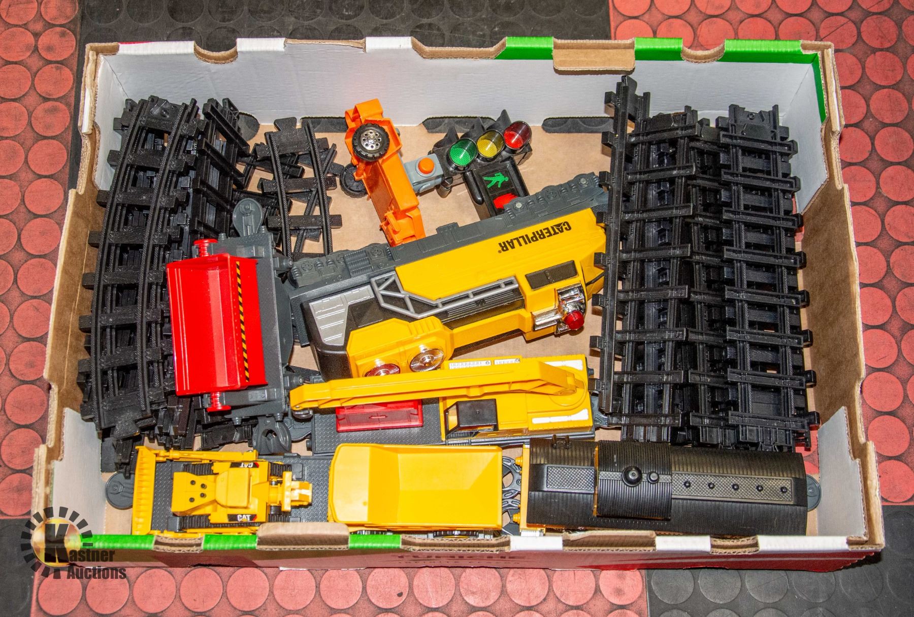 "CONSTRUCTION EXPRESS" MOTORIZED TOY TRAIN SET WITH TRACK - LARGE FORMAT ENGINE (12"L X 5"H X 2.75"W), SEVERAL CARS WITH EQUIPMENT AND CABOOSE, APPROX. 17 FEET OF TRACK, NEW C-CELL BATTERIES INSTALLED **ALL ITEMS MUST BE REMOVED BY 5PM SATURDAY, MARCH 23RD 2024. ALL REMAINING ITEMS WILL BE SUBJECT TO A $6.00 PER DAY STORAGE CHARGE. ANY ITEMS REMAINING AFTER MONDAY, APRIL 8TH, 2023 WILL BE CONSIDERED FORFEITED. NO REFUNDS WILL BE ISSUED FOR FORFEITED ITEMS. TO SCHEDULE A PICK UP APPOINTMENT CLICK HERE