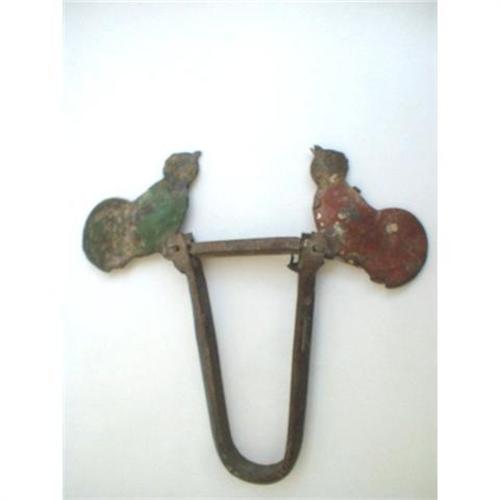 A very fine toy from pre 1950?s and could be older . The toy has a handle at the lower side and the upper side has two roosters . Upon pressing the lower handle towards each other , both the roosters on top moves towards each other as if fighting , the function repeats upon pressing the handle again and again . The roosters are painted green and red . The toy is in good shape and functional but still need a little repair to make it functional better.