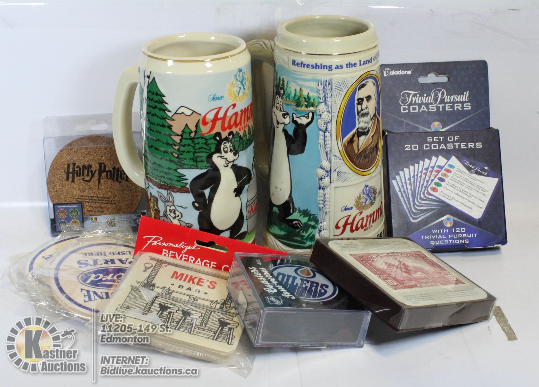 HAMMS CERAMIC BEER STEINS TALL LIMITED EDITIONS HANDCRAFTED #6268 & 4118 W/8 COASTERS SETS TRIVAL PURSUIT, OILERS, HARRY POTTER & MORE (UNUSED)