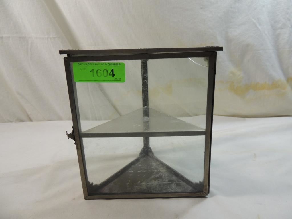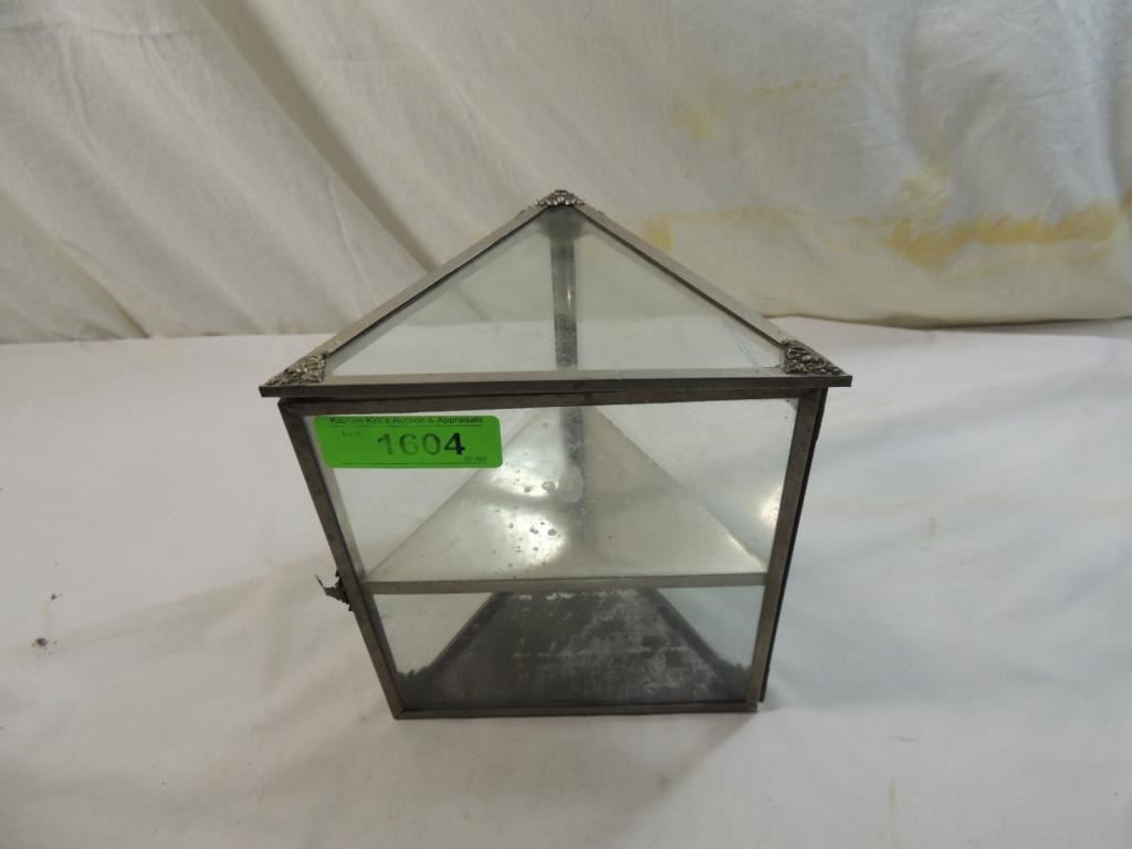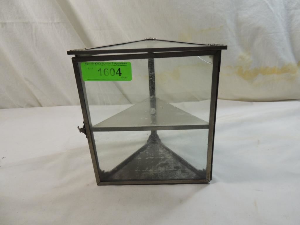 VINTAGE 2 TIER TRINGLE GLASS CURIO BOX TRIAGLE GLASS SHELF DISPLAY CURIO AS SHOWN SEE PHOTO FOR MORE DETAILS