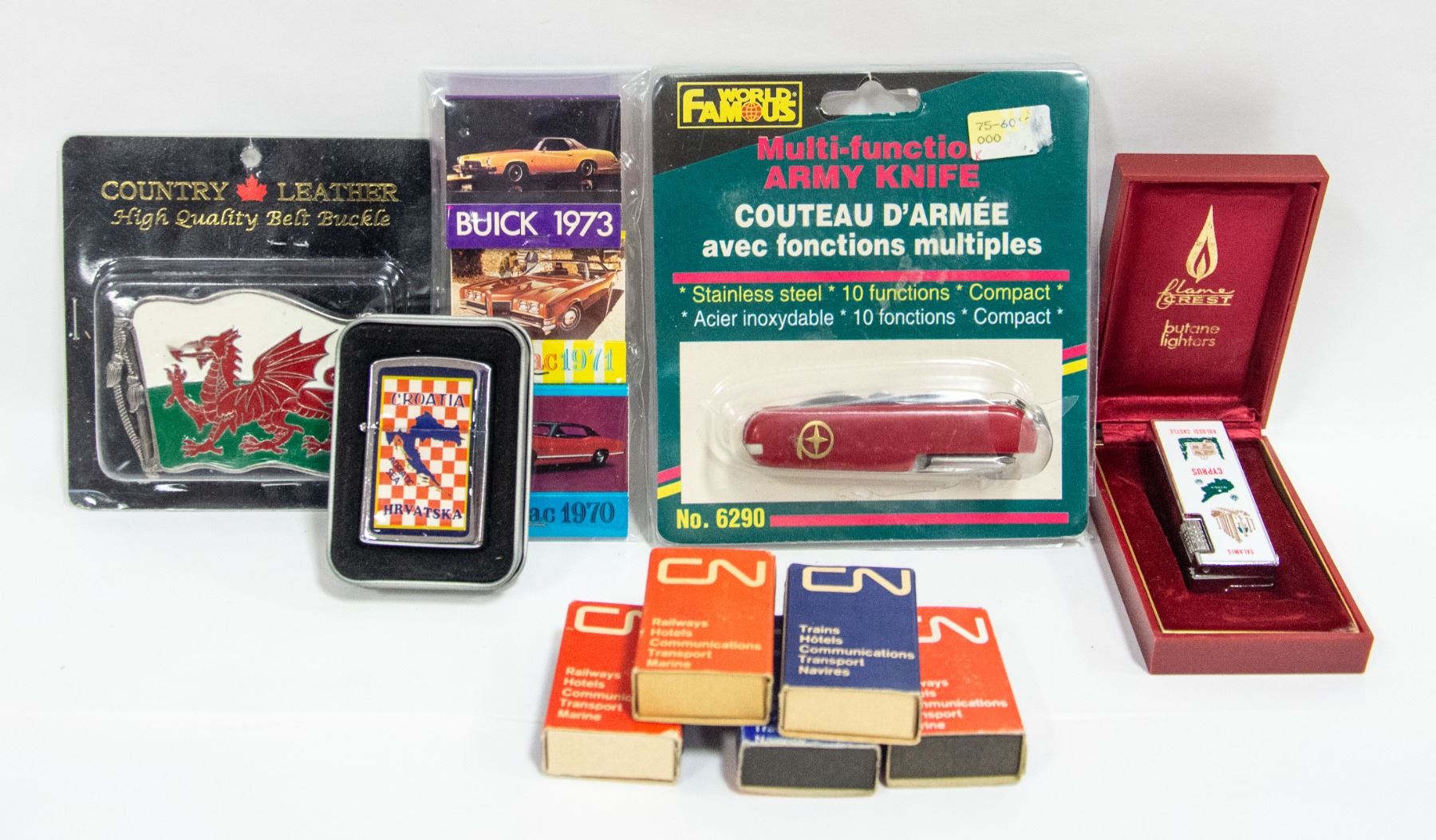 W/CN RAILWAY MATCHES & 1970-1973 OLD CAR MATCHES W/SEALED BELT BUCKLE + SEALED WORLD FAMOUS MULTI-FUNCTION ARMY KNIFE **ALL ITEMS MUST BE REMOVED BY 5PM SATURDAY, FEBRUARY 4TH 2023.** ALL REMAINING ITEMS WILL BE SUBJECT TO A $6.00 PER DAY STORAGE CHARGE. ANY ITEMS REMAINING AFTER MONDAY, FEBRUARY 20TH, 2023 WILL BE CONSIDERED FORFEITED. NO REFUNDS WILL BE ISSUED FOR FORFEITED ITEMS. TO SCHEDULE A PICK UP APPOINTMENT CLICK HERE