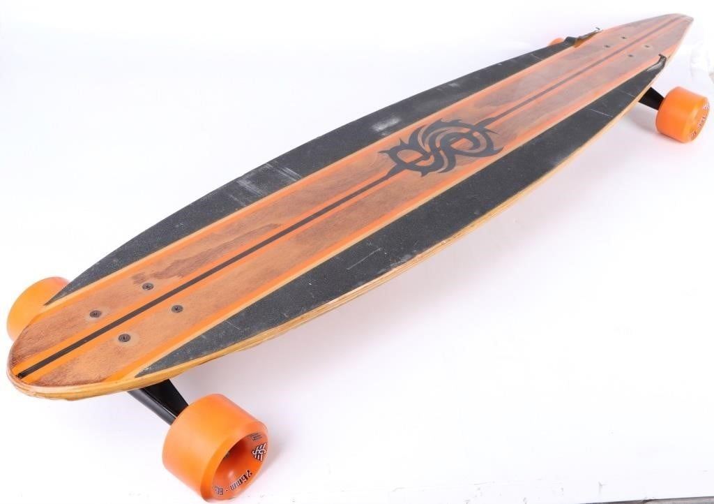 Vintage 2001 Slipknot Leftcoast Longboard to include 76mm - 80a Gravity GS wheels, an epoxy wood finish w/ friction surface on each side of board, and the Slipknot logo on top and bottom of the board.
