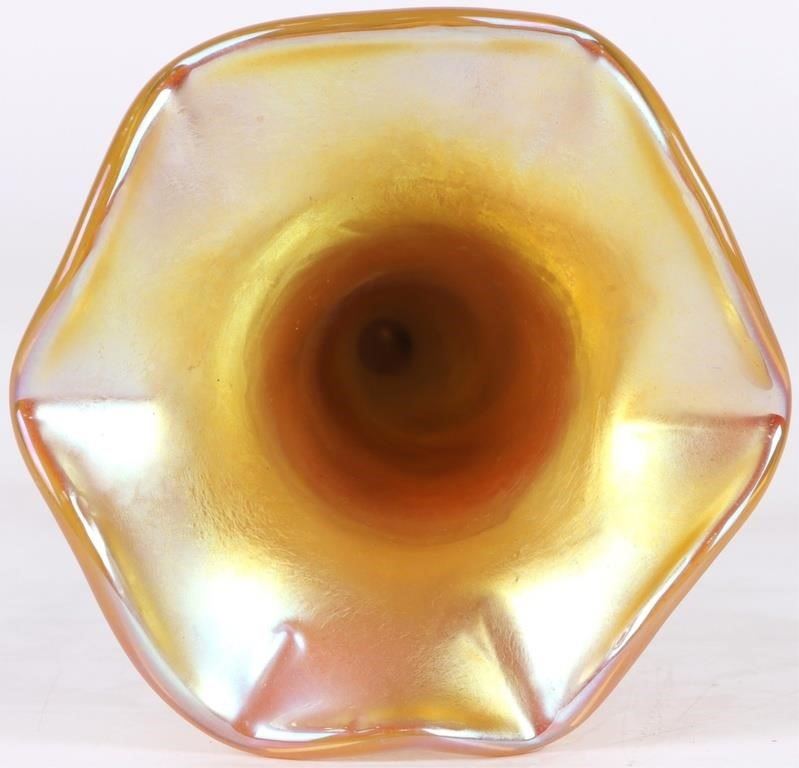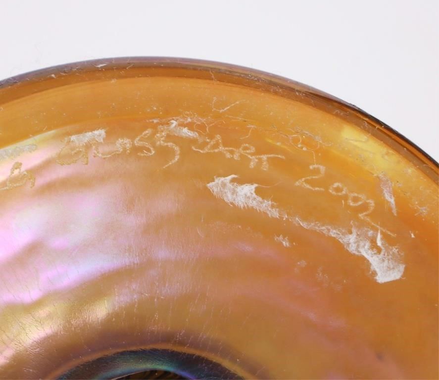 Vintage 2002 Steven Lundberg art glass vase signed to include a beautiful golden rainbow hue and a signature from Steven Lundberg on the bottom rim of the vase.