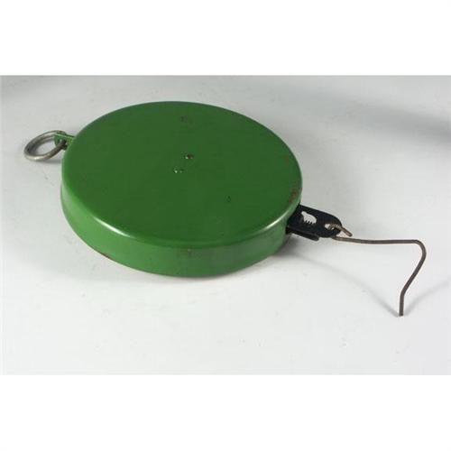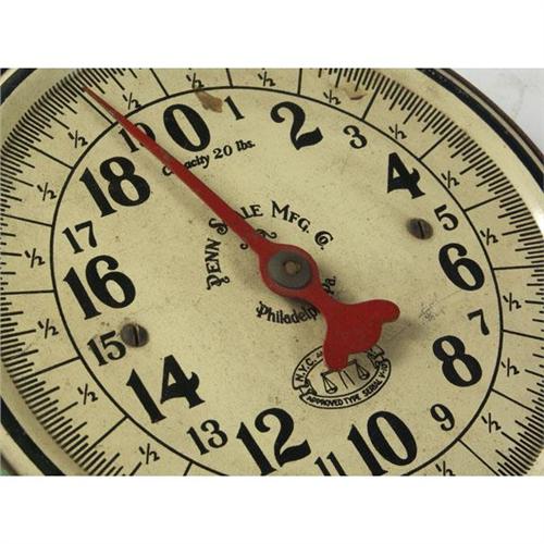 VINTAGE 20lb SCALE BY PENN SCALE MANUFACTURING: 20 pound capacity hanging scale manufactured by Penn Scale Manufacturing in Philadelphia, Pennsylvania. Marked with 'NYC and Penna Approved type serial V-10.' The back of the scale is green with minor scrapes and the face of the scale has some ware coming from age. The weighing mechanism is rusted. Measure markers as small as 1/16th of an inch.