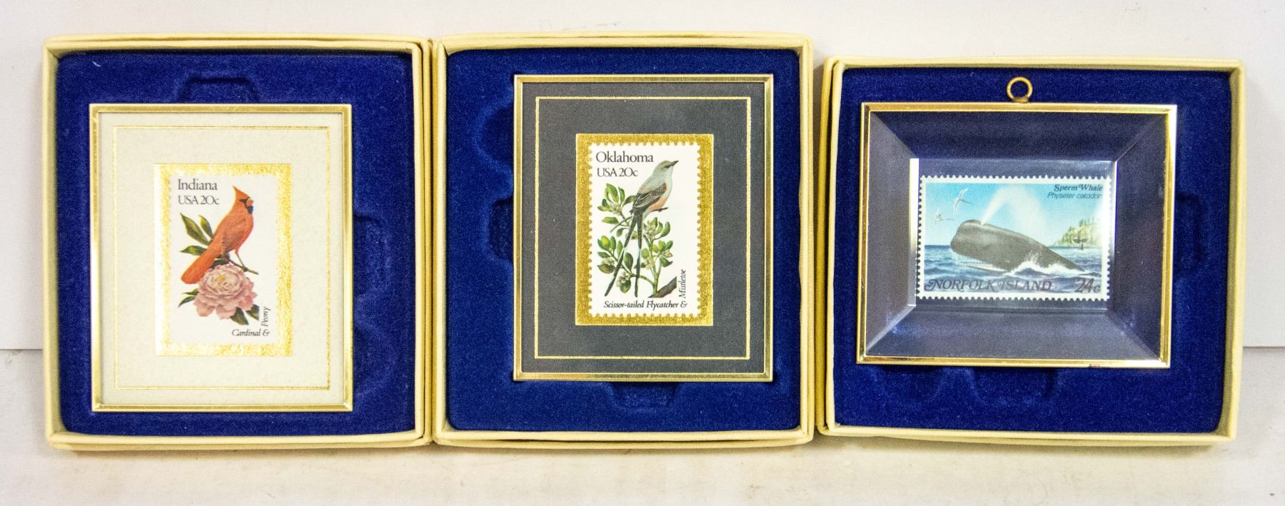 INCASED FRAMED STAMPS LIMITED EDITIONS IN ORIGINAL BOX'S 1966-1982 INDIANA STATE BIRDS & FLOWERS & 1982 OKLAHOMA STATE BIRD & FLOWER & 1989 SPERM WHALE NORFOLK ISLAND