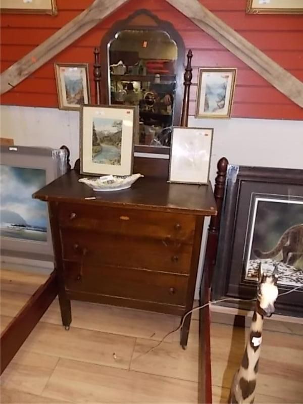 VINTAGE 3 DRAWER DRESSER WITH MIRROR MIRROR CRACKED AT BOTTOM RIGHT