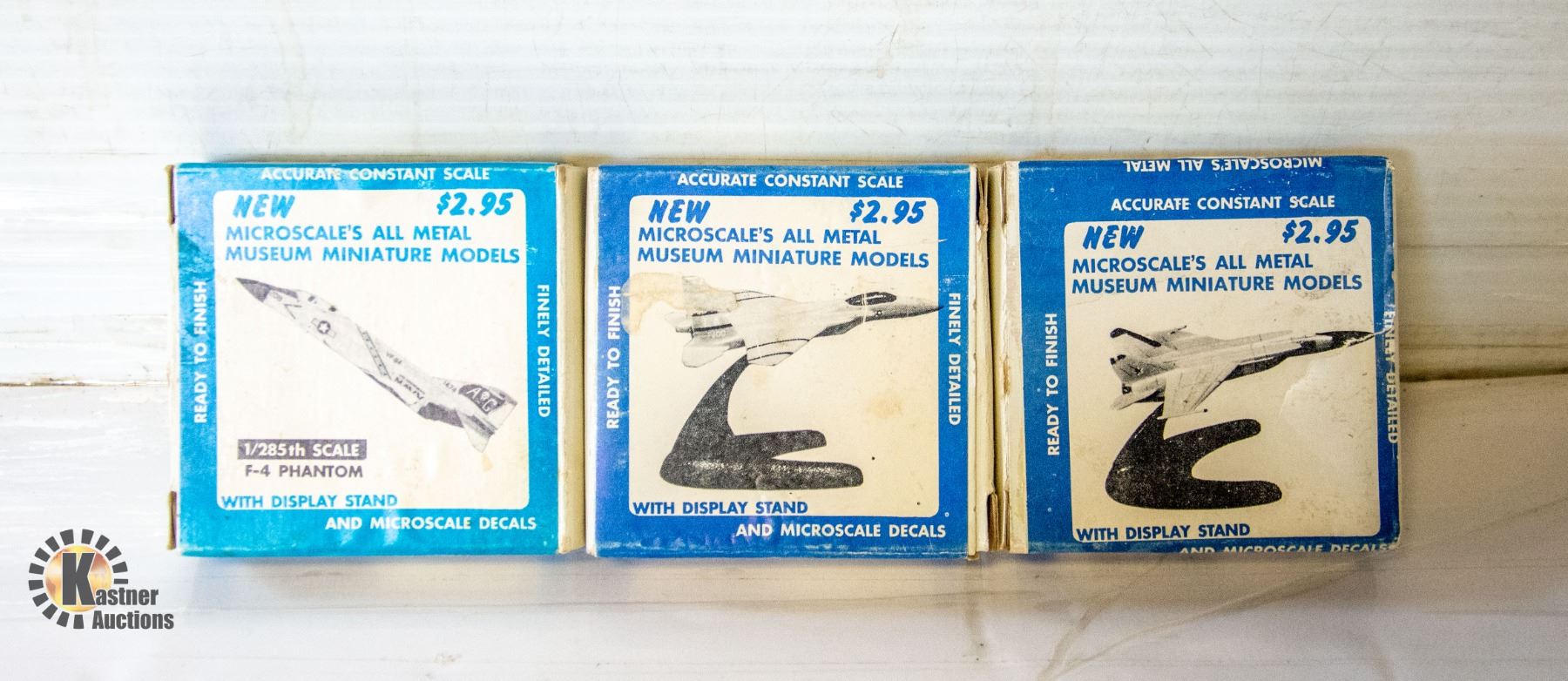 METAL MUSEUM MINATURE MODELS WITH DISPLAY STAND 1/285TH SCALE NO. 285-1 F-4 PHANTOM, NO. 285-2 F-15 EAGLE, NO. 285-3 MIG-25 FOXBAT (NEW IN BOX)
