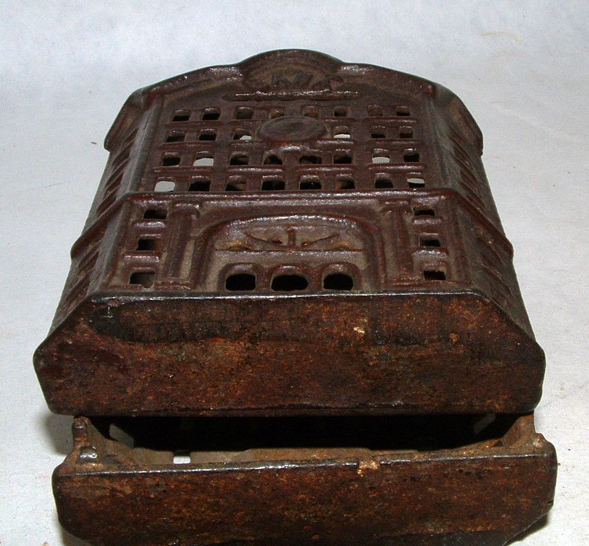 Measures approx 3-3/4" x 3-1/8" x 2" Lovely original aged patina. Screw is broken.