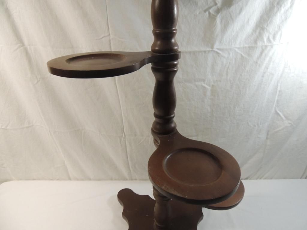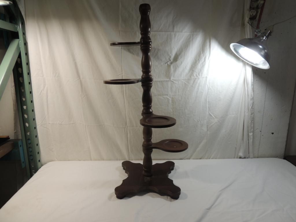 VINTAGE 4 TIERED WOODEN PLANT STAND. DECORATIVE STAND. AS SHOWN SEE PHOTO FOR MORE DETAILS.
