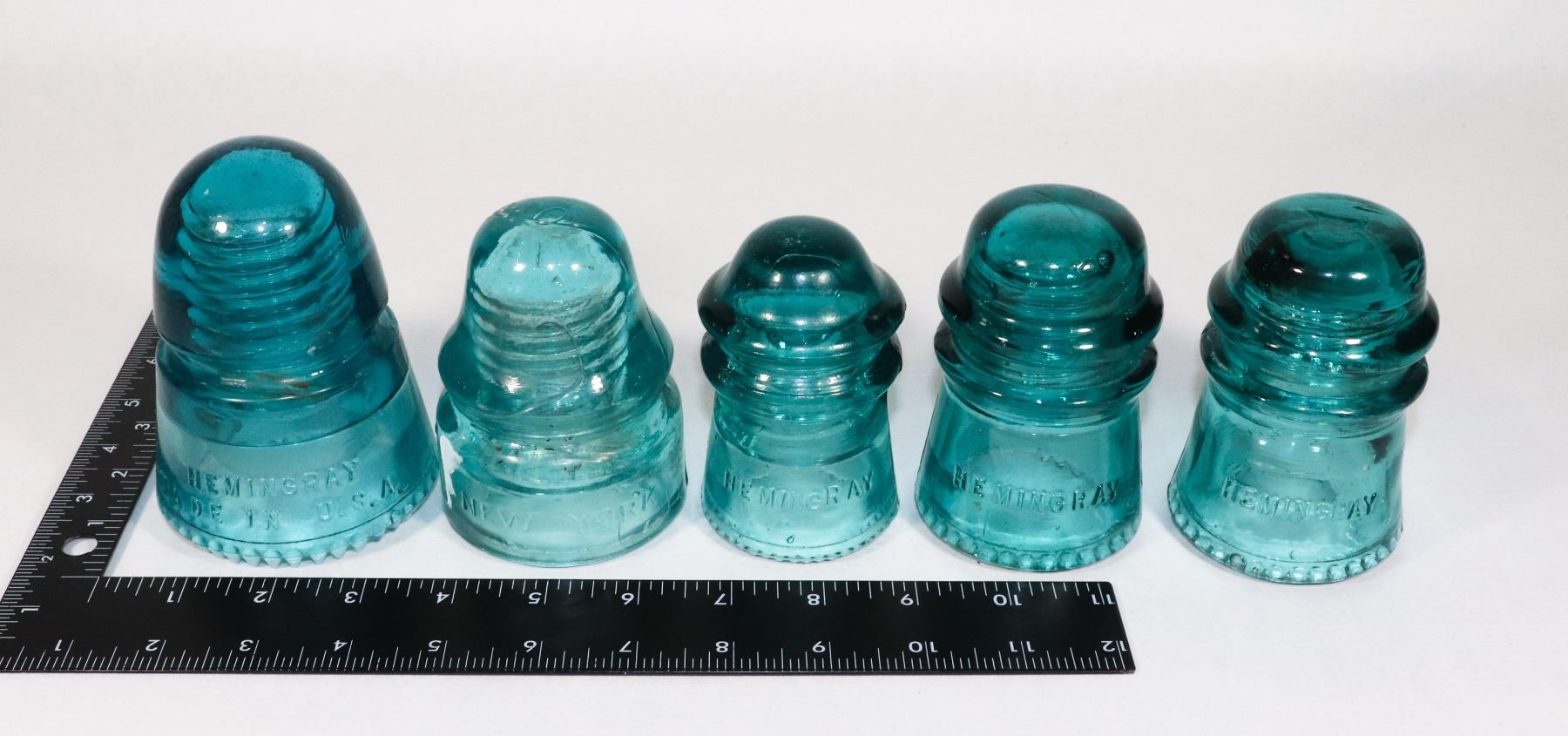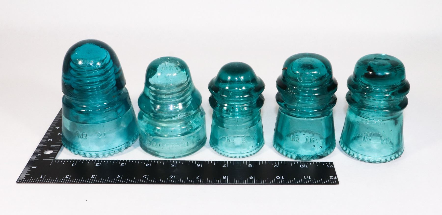 VINTAGE 5 TEAL BLUE GLASS INSULATORS