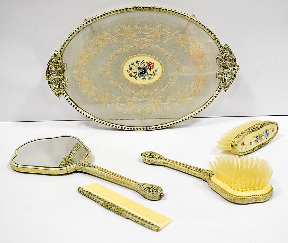 VINTAGE 5PC VANITY SET W/ GLASS TRAY, MIRROR, COMB