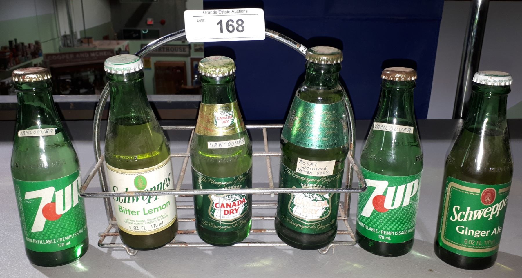 VINTAGE 6 PACK POP CARRIER W/FULL 7-UP, CANADA DRY, AND SCHWEPPES POP BOTTLES