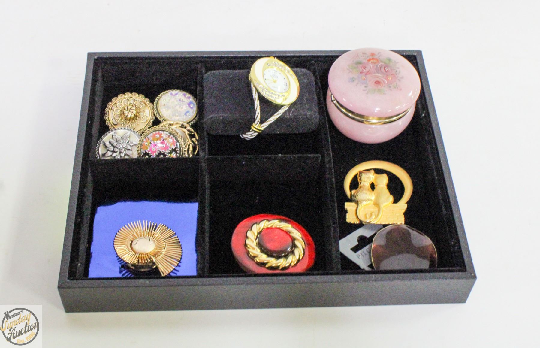 1 BUTLER W/BROOCH MADE IN ITALY (RED), TRINKET MINI JEWLERY BOX MADE IN ITALY, PILGRIM BROOCH, JJ BROOCH W/NEW FUSSY QUARTZ BANGLE WATCH (SEAL ON BACK) **ALL ITEMS MUST BE REMOVED BY 5PM SATURDAY, DECEMBER 6TH 2025. ALL REMAINING ITEMS WILL BE SUBJECT TO A $6.00 PER DAY STORAGE CHARGE. ANY ITEMS REMAINING AFTER MONDAY, DECEMBER 22ND 2025 WILL BE CONSIDERED FORFEITED. NO REFUNDS WILL BE ISSUED FOR FORFEITED ITEMS. TO SCHEDULE A PICK UP APPOINTMENT CLICK HERE