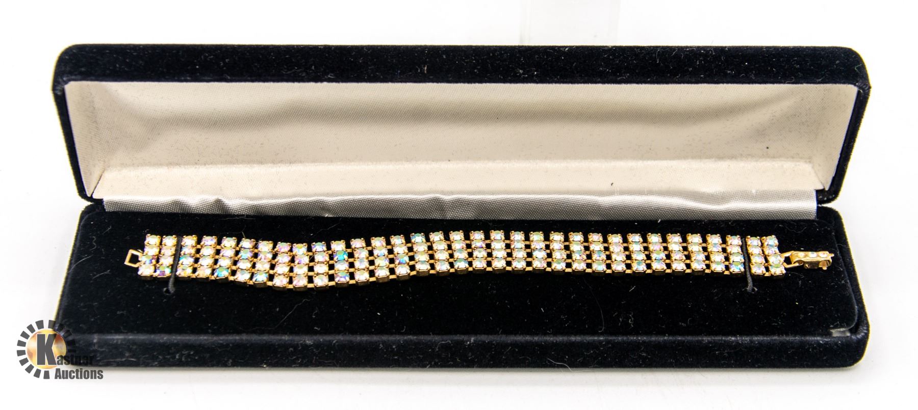 RHINESTONE BRIDAL BRACELET W/ FOLDING CLASP IN GOLD TONE SETTING **ALL ITEMS MUST BE REMOVED BY 5PM SATURDAY, MAY 20TH 2023. ALL REMAINING ITEMS WILL BE SUBJECT TO A $6.00 PER DAY STORAGE CHARGE. ANY ITEMS REMAINING AFTER MONDAY, JUNE 5TH, 2023 WILL BE CONSIDERED FORFEITED. NO REFUNDS WILL BE ISSUED FOR FORFEITED ITEMS. TO SCHEDULE A PICK UP APPOINTMENT CLICK HERE