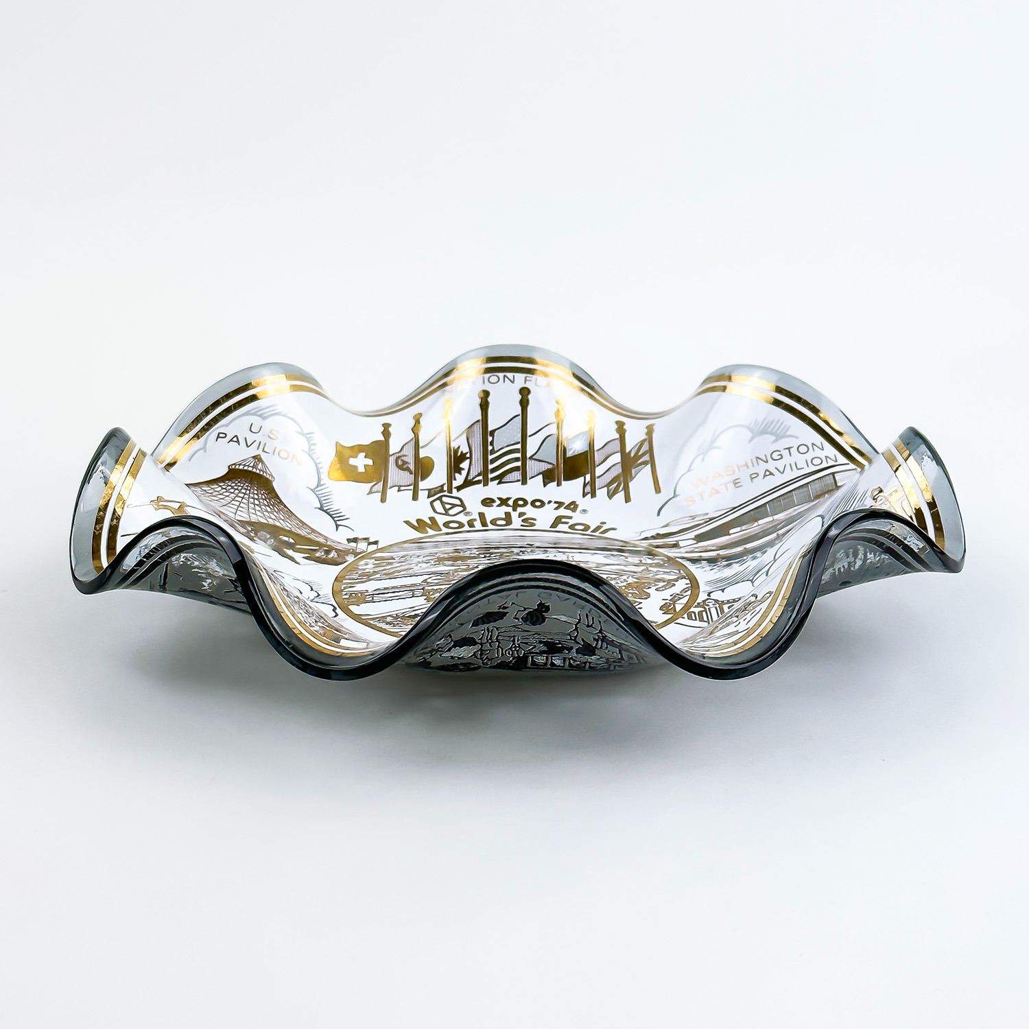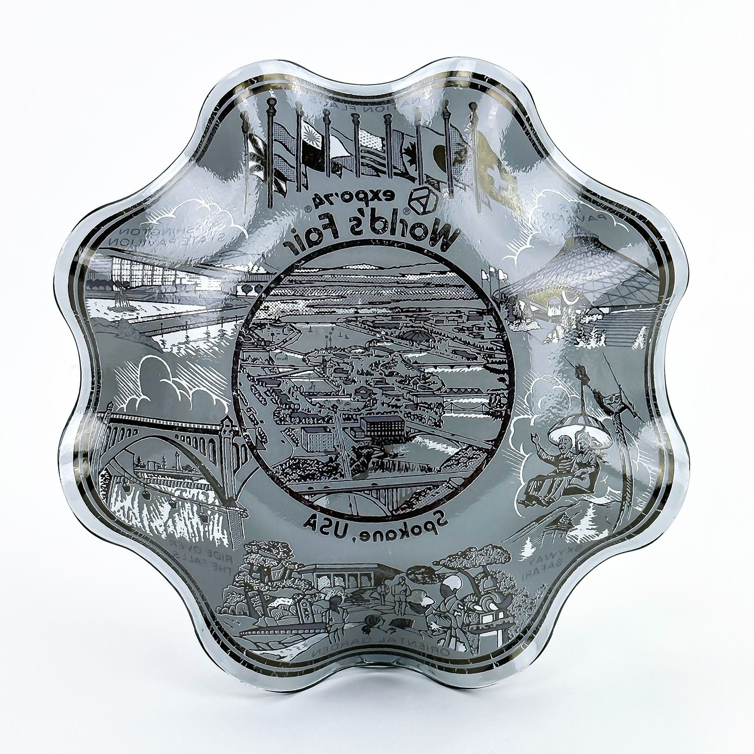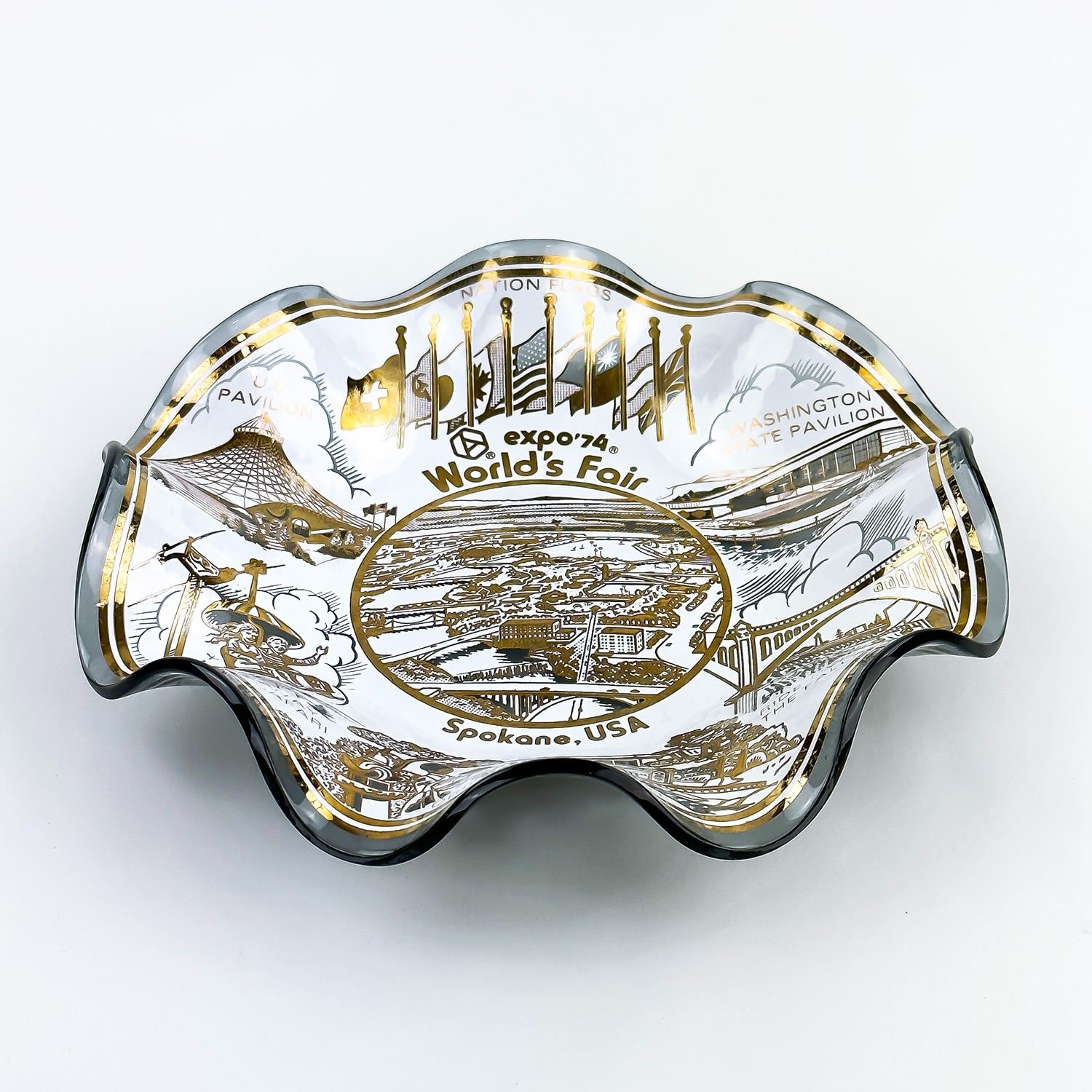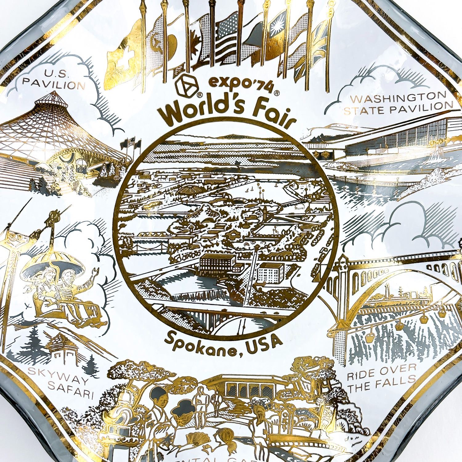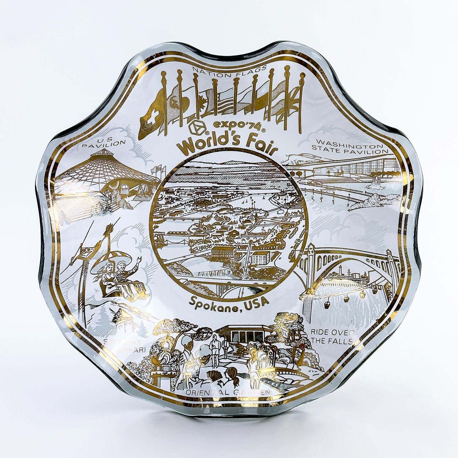 #8112 - COLLECTIBLE SOUVENIR. EXPOSITION - EXPO 1974 - SPOKANE, WASHINGTON, USA - GLASS TRAY OR CANDY DISH. WASHINGTON STATE PAVILION, SKYWAY SAFARI, U.S. PAVILION, NATION FLAGS ETC. MEASURES: 7” (18 CM) DIAMETER AND SITS 1.375” (3.5 CM) HIGH
