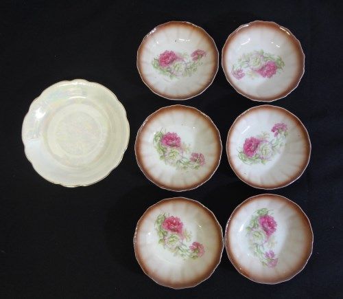 6 5 1/2" ROSE PATTERNED BOWLS WITH BROWN TRIM AROUND RIM. 1 7" PLATE WITH PEARL LIKE GLAZE. NO MARKINGS. FAIR CONDITION.