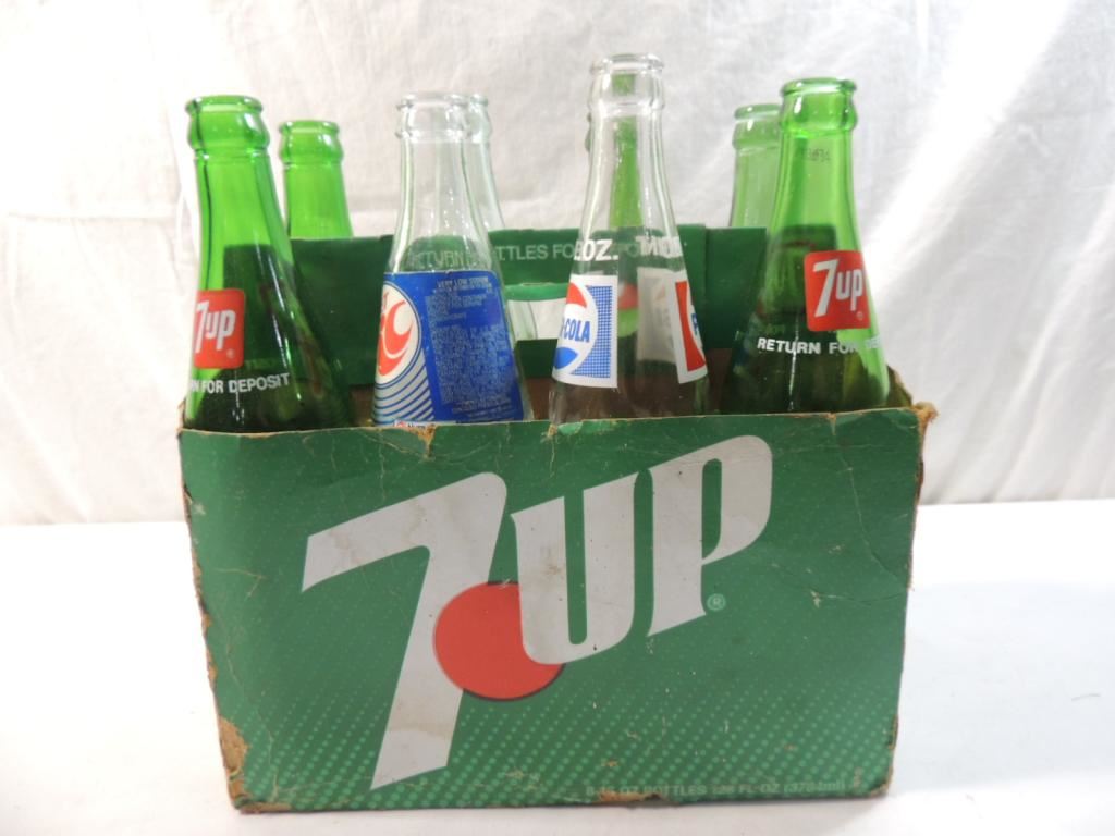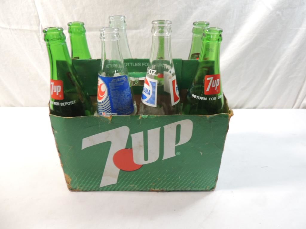 8 PACK VINTAGE 7UP BOX WITH GLASS BOTTLES PEPSI AND 7UP BOTTLES VINTAGE PINTS AS SHOWN SEE PHOTO FOR MORE DETAILS
