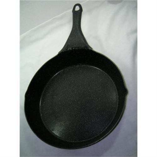 This is a beautiful black graniteware skillet or fry pay with white speckles. The skillet measures 9-1/4" in diameter with 2 pour spouts. It is 2" deep with a 6-1/4" long handle. The back of the handle is folded over. It is of one piece construction made of heavy steel. It is in very good condition and can still be used. All of the enamel is still in place. The bottom is well worn. I see no dents, dings or chips to the enamel.
