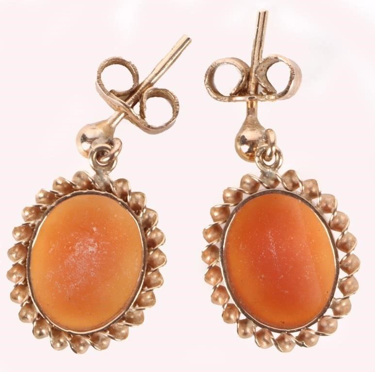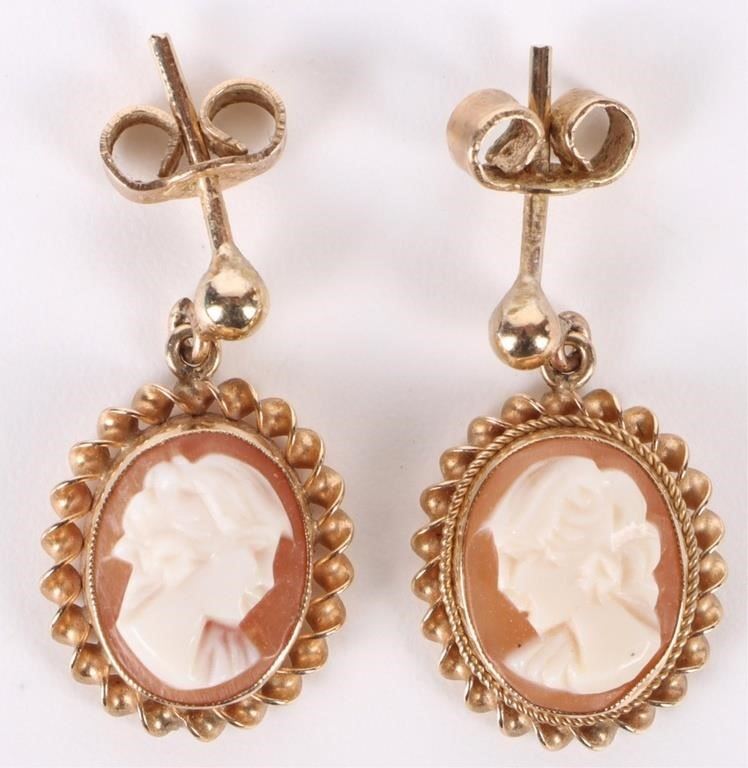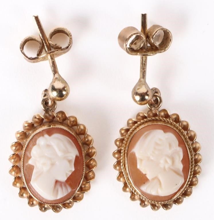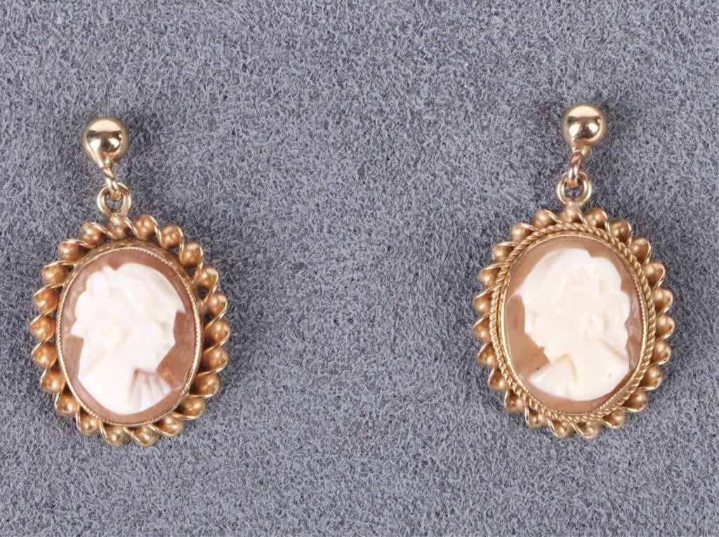 Vintage 9K yellow gold cameo solitare ladies earrings to include an enamel carved portrait of a lady on each earring, with a beautiful double coiled gold frame.