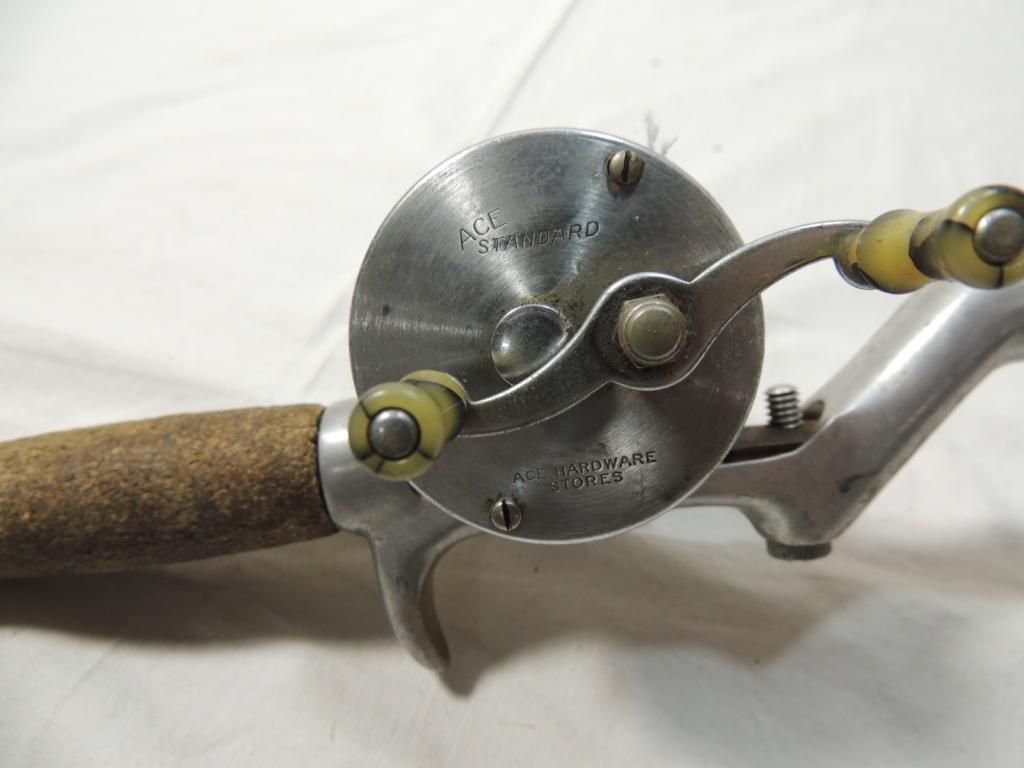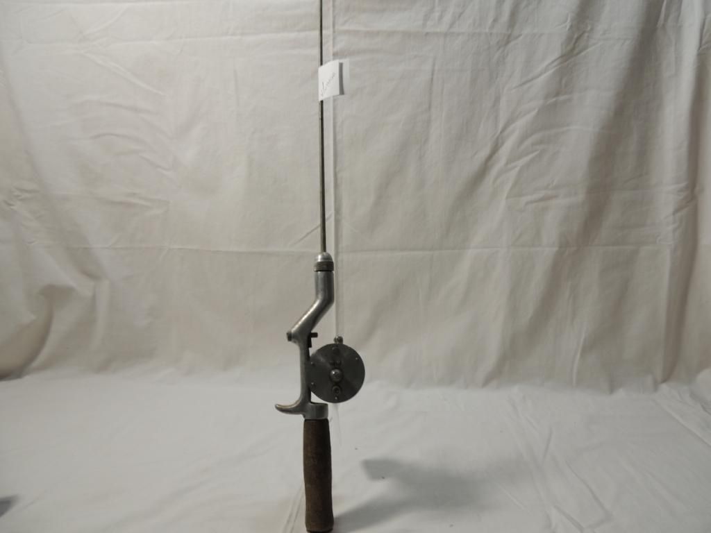 VINTAGE METAL FISHING POLL WITH REEL CORK HANDLE. . AS SHOWN. SEE PHOTO FOR MORE DETAILS.