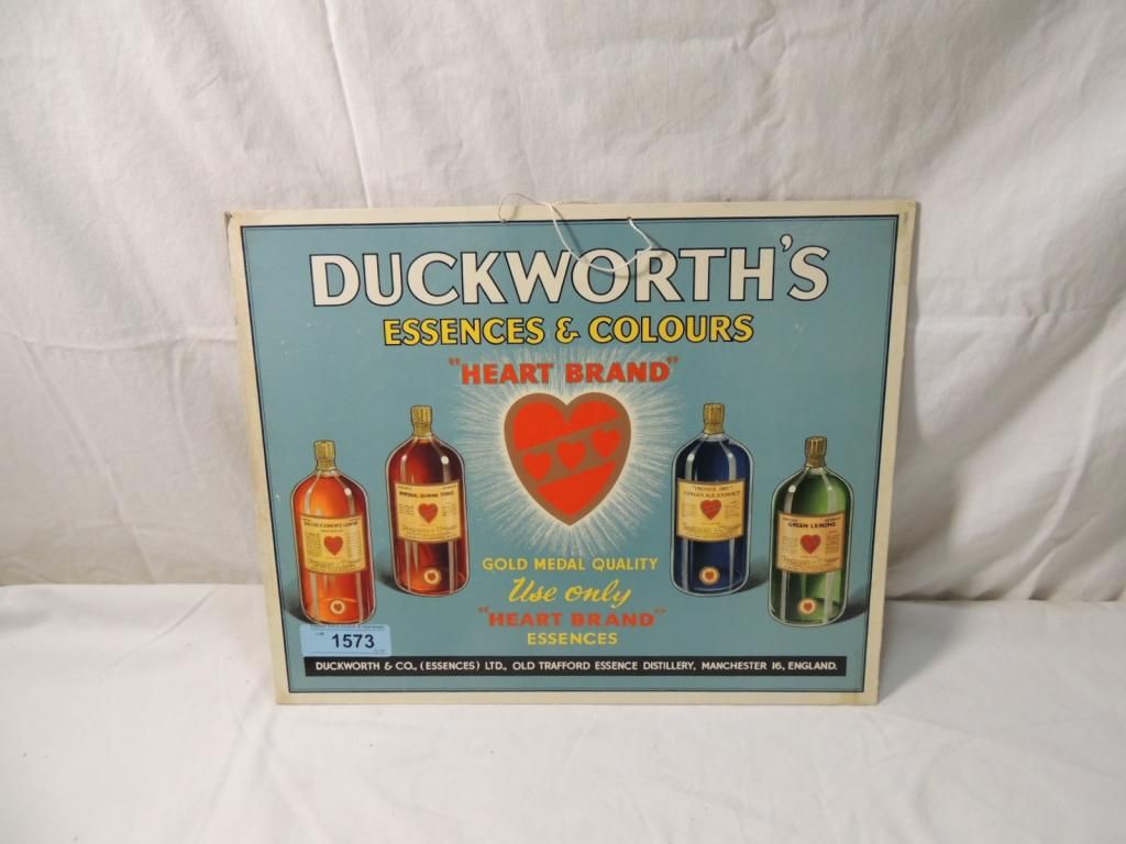 OLD CARD SHOWCARD SHOP SIGN DUCKWORTHS ESSENCES AND COLOURS HEART BRAND SIGN. 17 1/2" X 14" VINTAGE ADVERTISEMENT. VINTAGE SIGNS. AS SHOWN. SEE PHOTO FOR MORE DETAILS