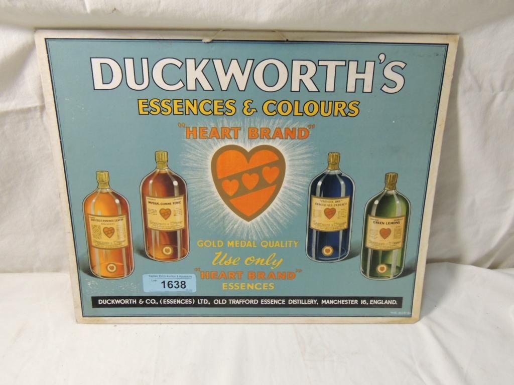 OLD CARD SHOWCARD SHOP SIGN DUCKWORTHS ESSENCES AND COLOURS HEART BRAND SIGN. 17 1/2" X 14" VINTAGE ADVERTISEMENT. VINTAGE SIGNS. AS SHOWN. SEE PHOTO FOR MORE DETAILS