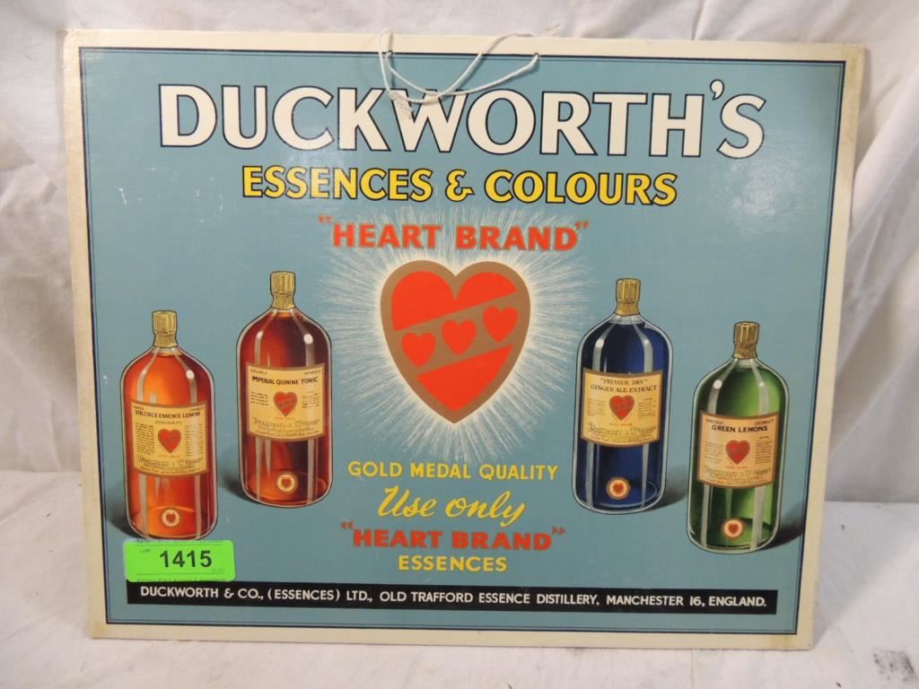 OLD CARD SHOWCARD SHOP SIGN DUCKWORTHS ESSENCES AND COLOURS HEART BRAND SIGN. 17 1/2" X 14" VINTAGE ADVERTISEMENT. VINTAGE SIGNS. AS SHOWN. SEE PHOTO FOR MORE DETAILS5