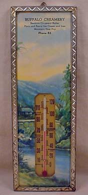 VINTAGE ADVERTISING THERMOMETER - BUFFALO CREAMERY - Beehive Creamery Butter, Plain and Fancy Ice Cream and Ices, Mountain Dew Pop.