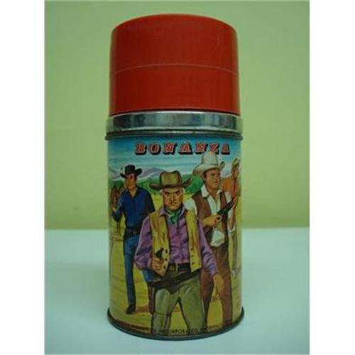 LOVELY COLLECTIBLE THERMOS BOTTLE, DEPICTING CREW AND SCENES FROM MOST POPULAR OF THAT TIME SHOW - BONANZA, COMPLETE AND IN EXCELLENT USED CONDITION, NO CHIPSOR CRACKS, BOTTOM HAS OXIDASED A BIT, AND MORE IMAGE ARE AVAILABLE PER REQUEST, IT STANDS ABOUT 6 1/2 inch high INTERIOR IS NICE, SHINY AND CLEAN, MADE BY ALADDIN INDUSTRIES INCORPORATED, NASHVILLE TENN., U.S.A., THE BOTTOM READS SAME INFO BUT MADE IN CANADA, SO I ASSUME SOME PARTS ARE MADE IN USA AND SOME IN CANADA?,US Buyer please remit 8.00 for shipping plus insurance.THANKS.