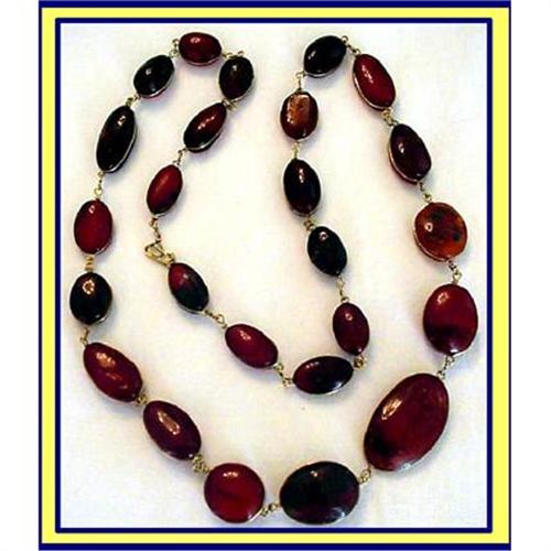 Vintage amber bead necklace. Origin unknown, but certainly old vintage.<BR>27 1/2inches long when open.<BR>Amber beads of various shapes and sizes, loosely graded with the largest piece in the center.<BR>Pretty gilt mounting and chain with clasp. The amber is a wonderful dark colour - cherry or dark wine coloured with light flashing and glittering. Some of the beads are rough, perhaps due to weaknesses and age.